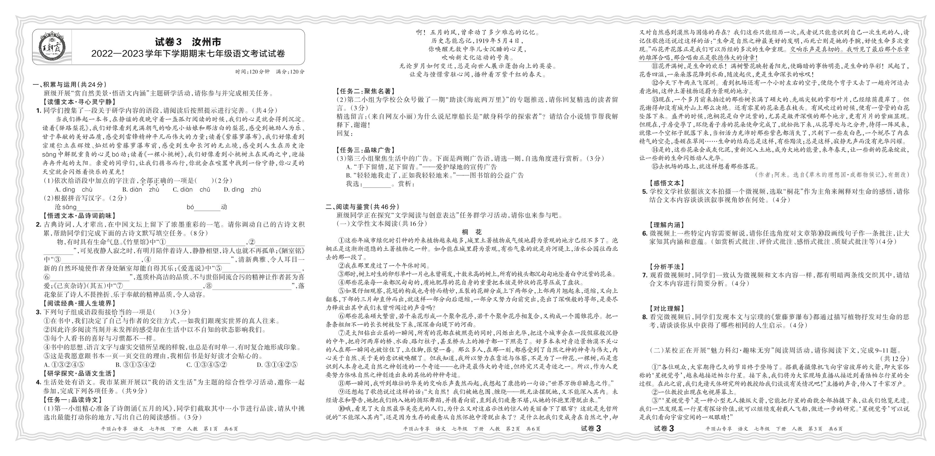 河南省平顶山市汝州市2022-2023学年下学期期末七年级语文考试试卷(人教版)【3】