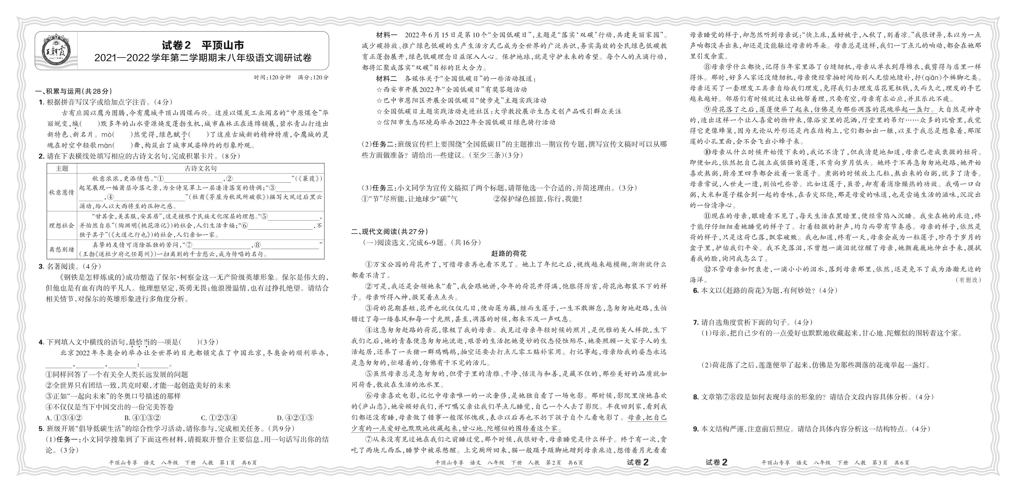 河南省平顶山市2021-2022学年第二学期期末八年级语文调研试卷(人教版)【2】