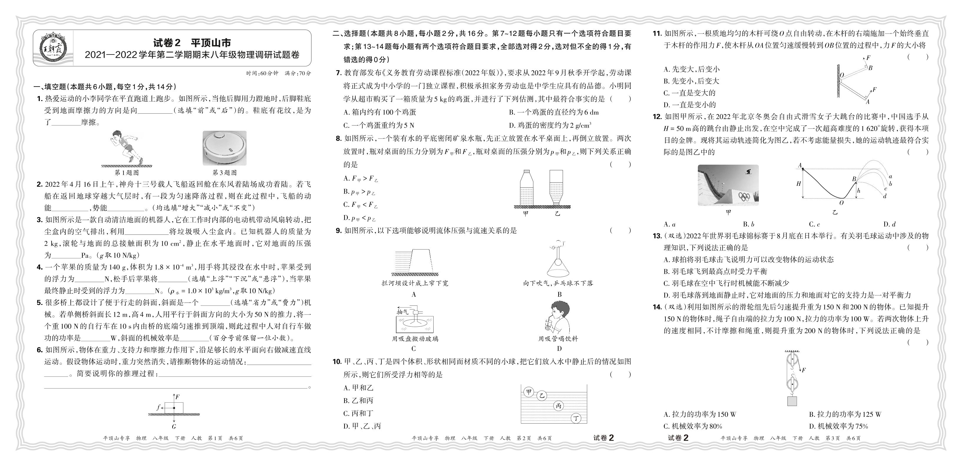 河南省平顶山市2021-2022学年第二学期期末八年级物理调研试题卷(人教版)【2】
