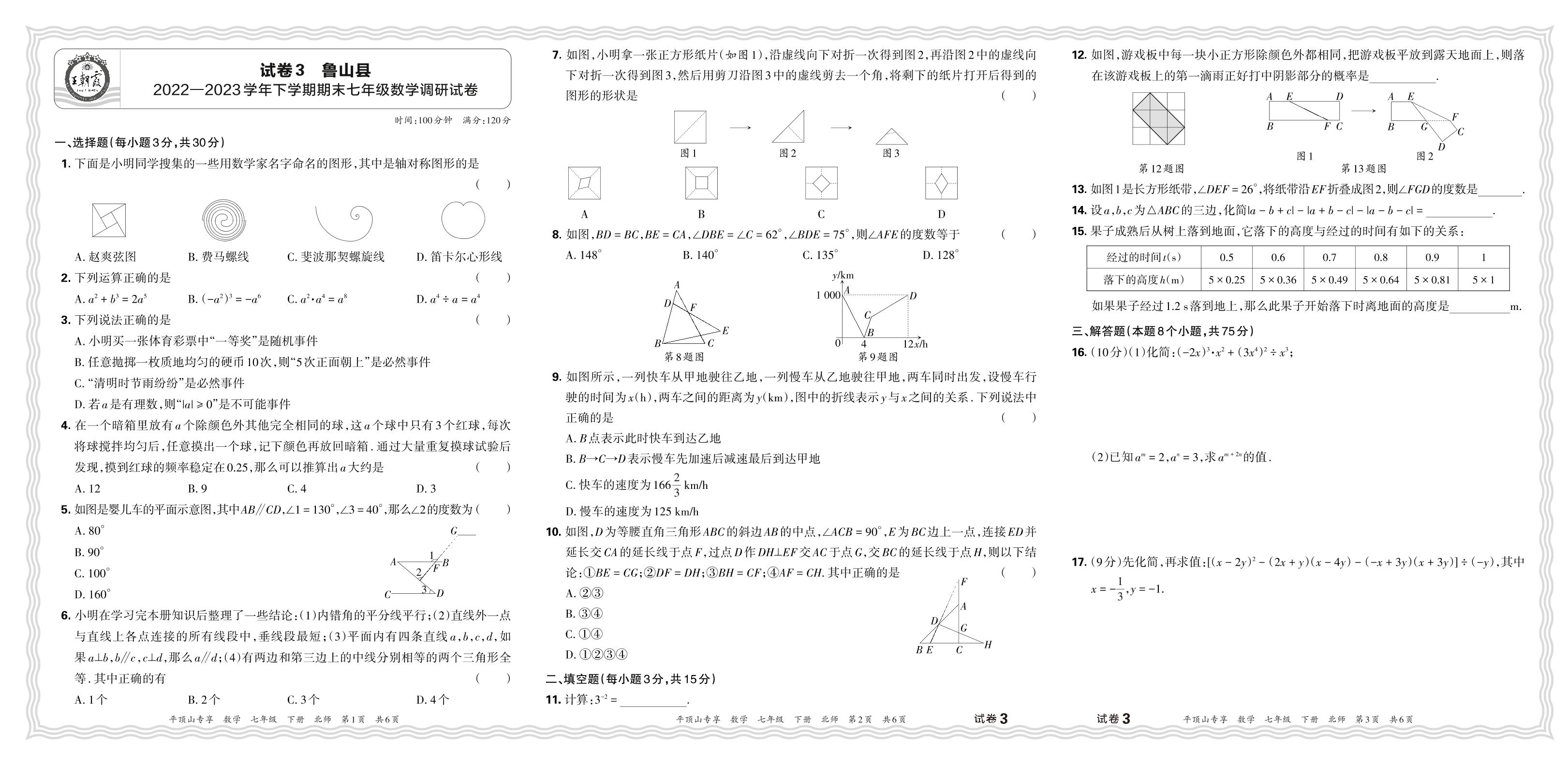 河南省平顶山市鲁山县2022-2023学年下学期期末七年级数学调研试卷(北师版)【3】