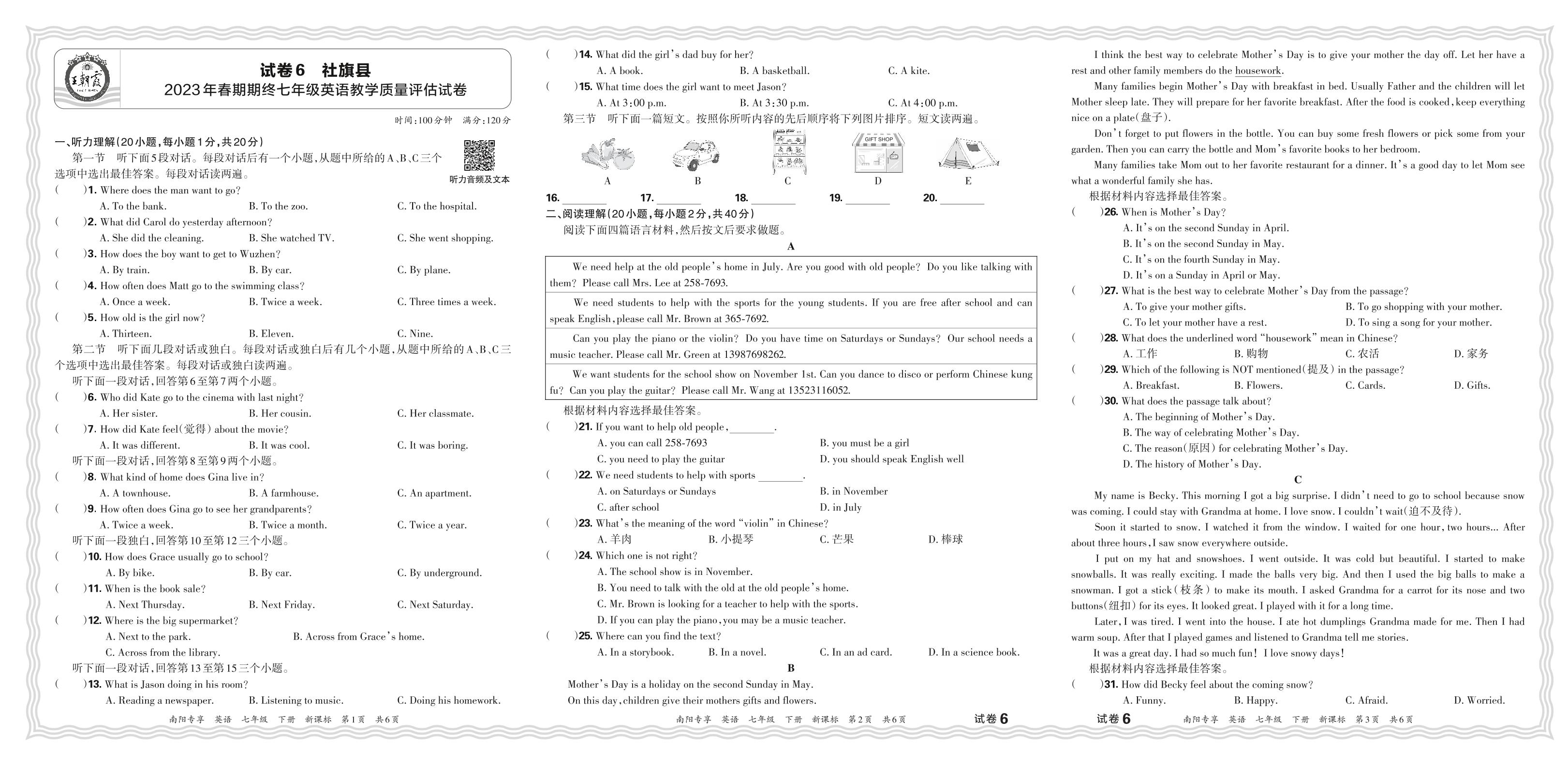 河南省南阳市社旗县2023年春期期终七年级英语教学质量评估试卷(新课标版)【6】