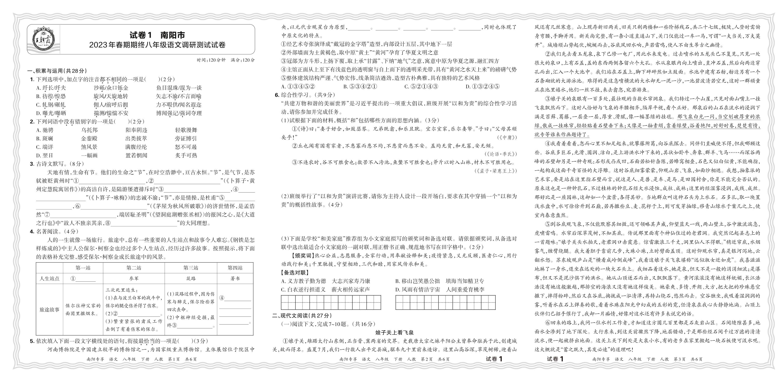 河南省南阳市2023年春期期终八年级语文调研测试试卷(人教版)【1】