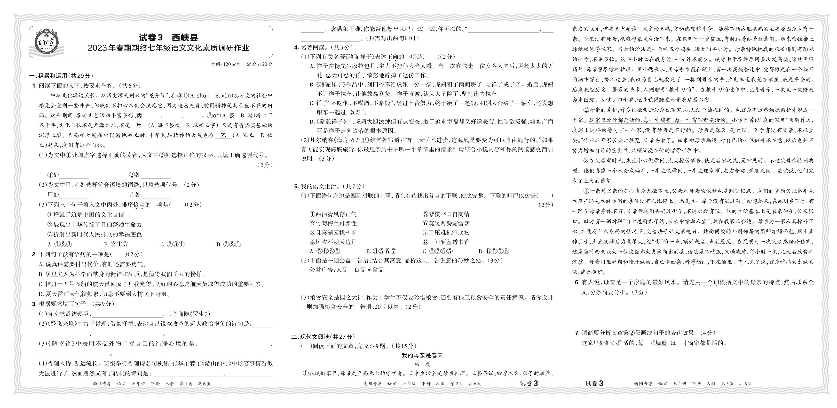 河南省南阳市西峡县2023年春期期终七年级语文文化素质调研作业(人教版)【3】