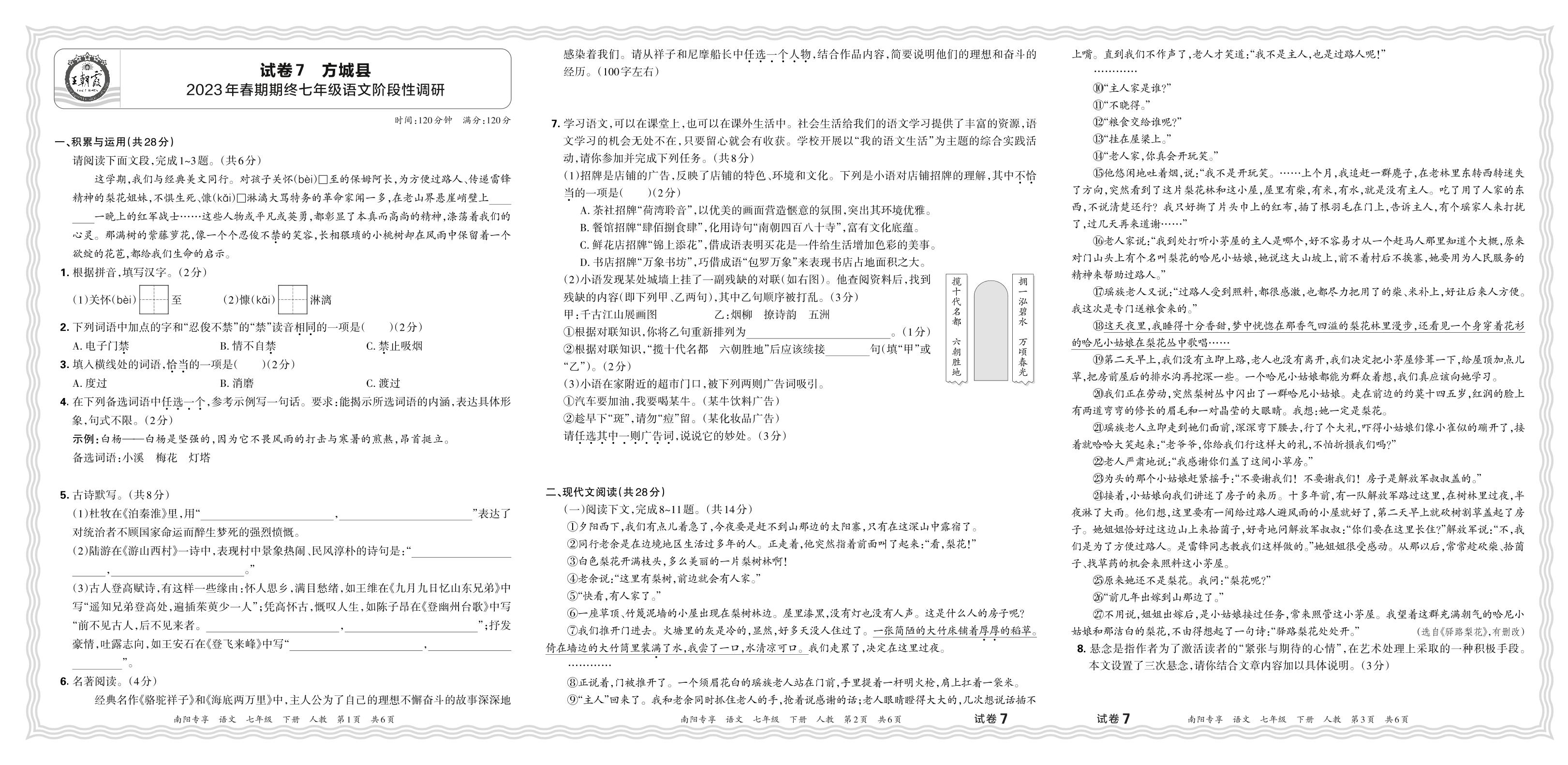 河南省南阳市方城县2023年春期期终七年级语文阶段性调研(人教版)【7】