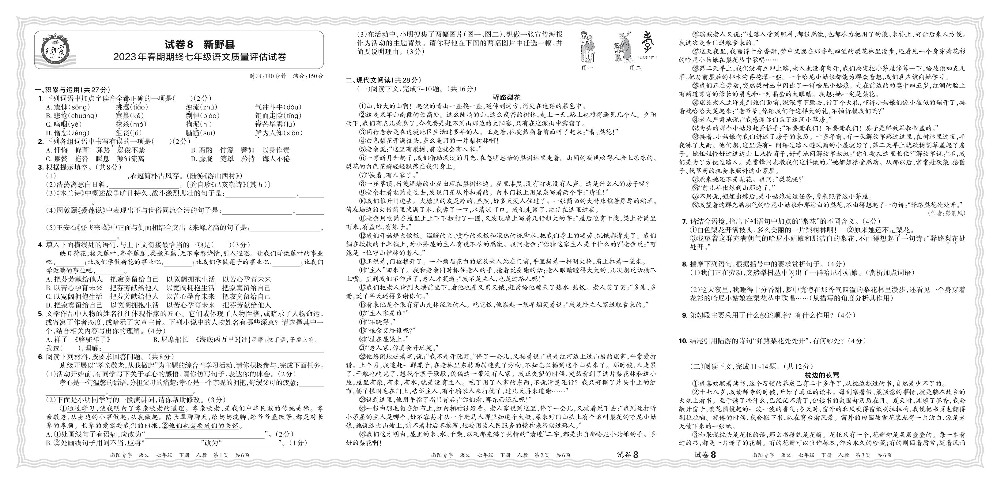 河南省南阳市新野县2023年春期期终七年级语文质量评估试卷(人教版)【8】