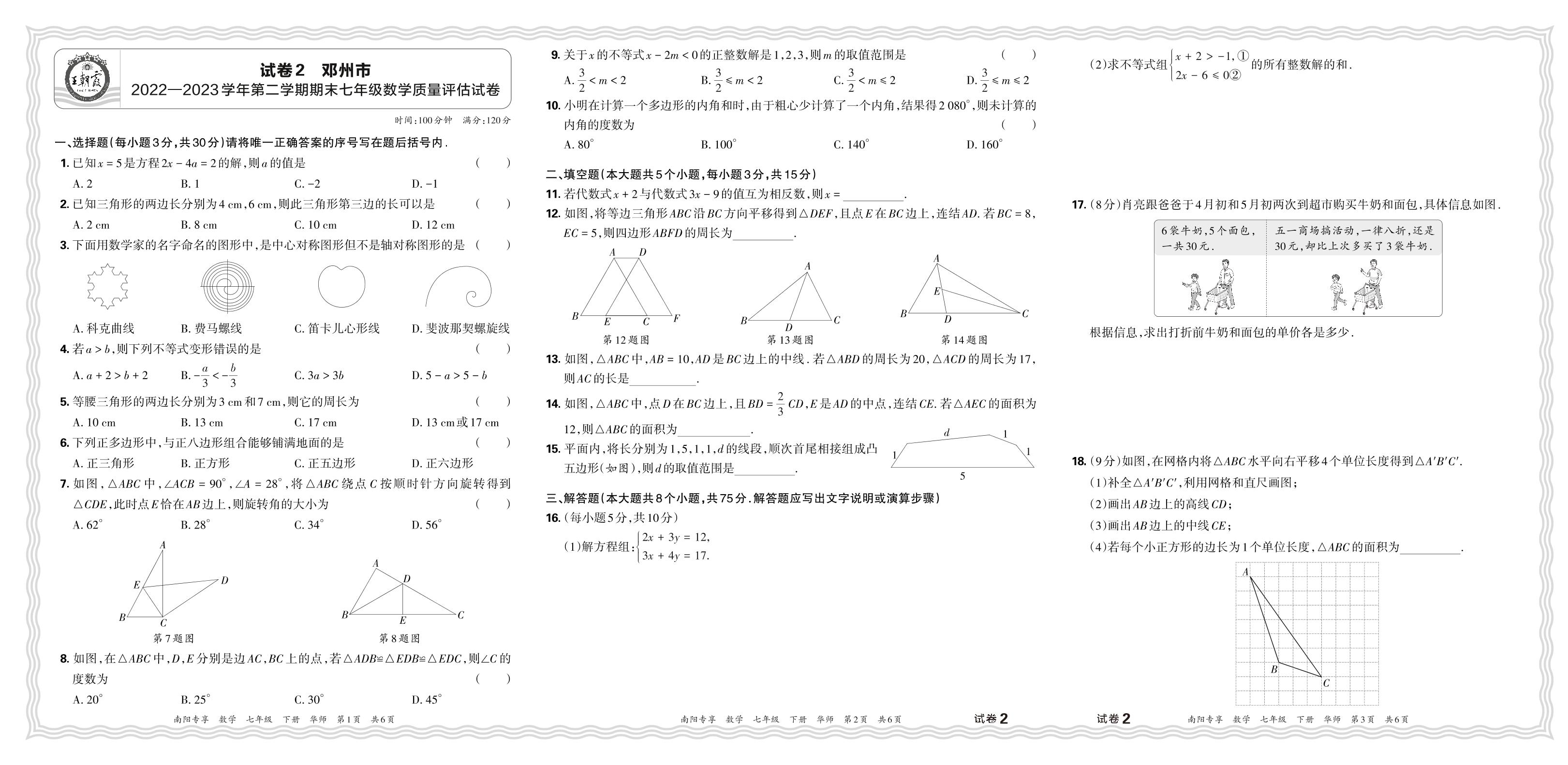河南省南阳市邓州市2022-2023学年第二学期期末七年级数学质量评估试卷(华师版)【2】