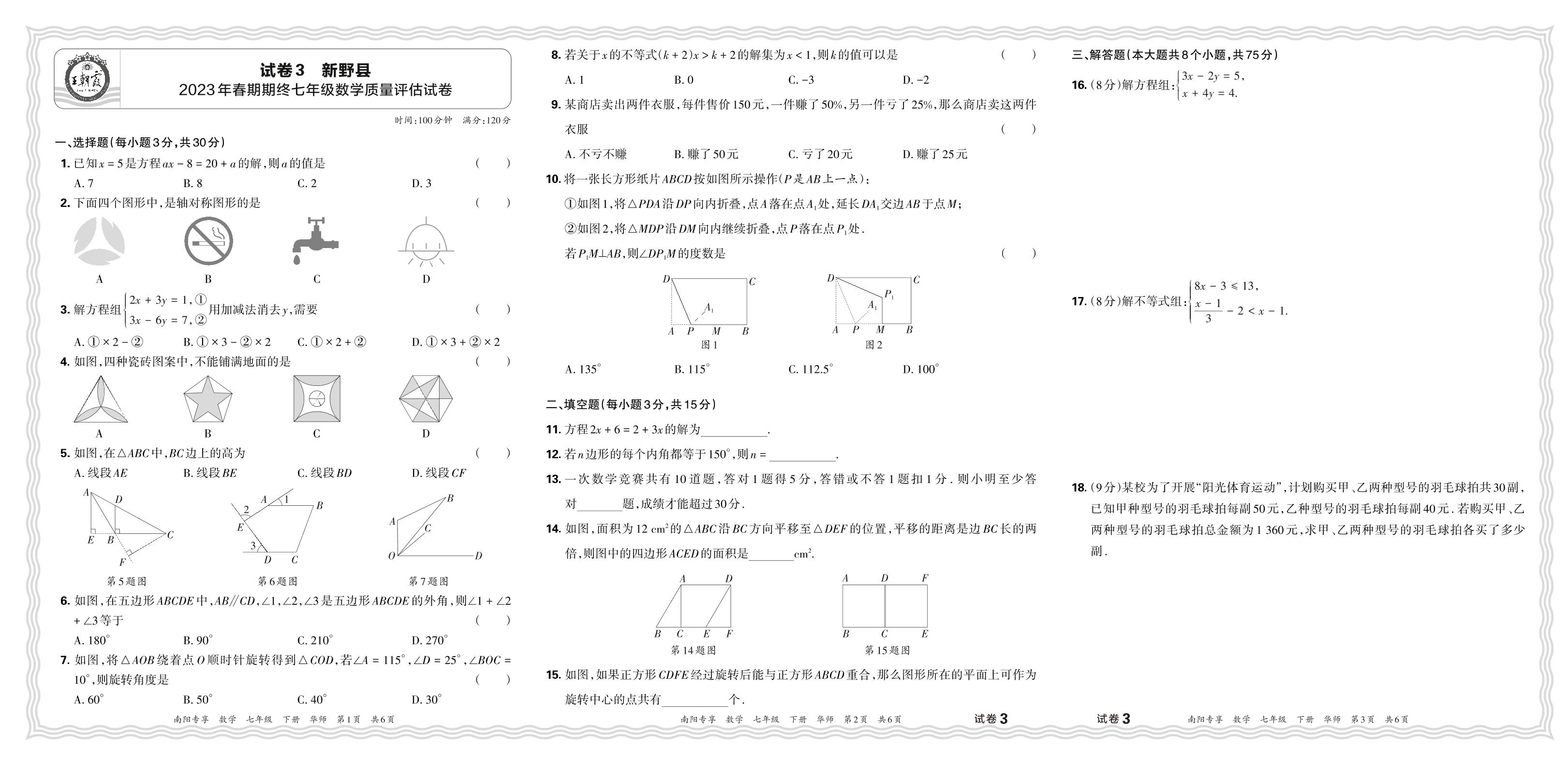 河南省南阳市新野县2023年春期期终七年级数学质量评估试卷(华师版)【3】