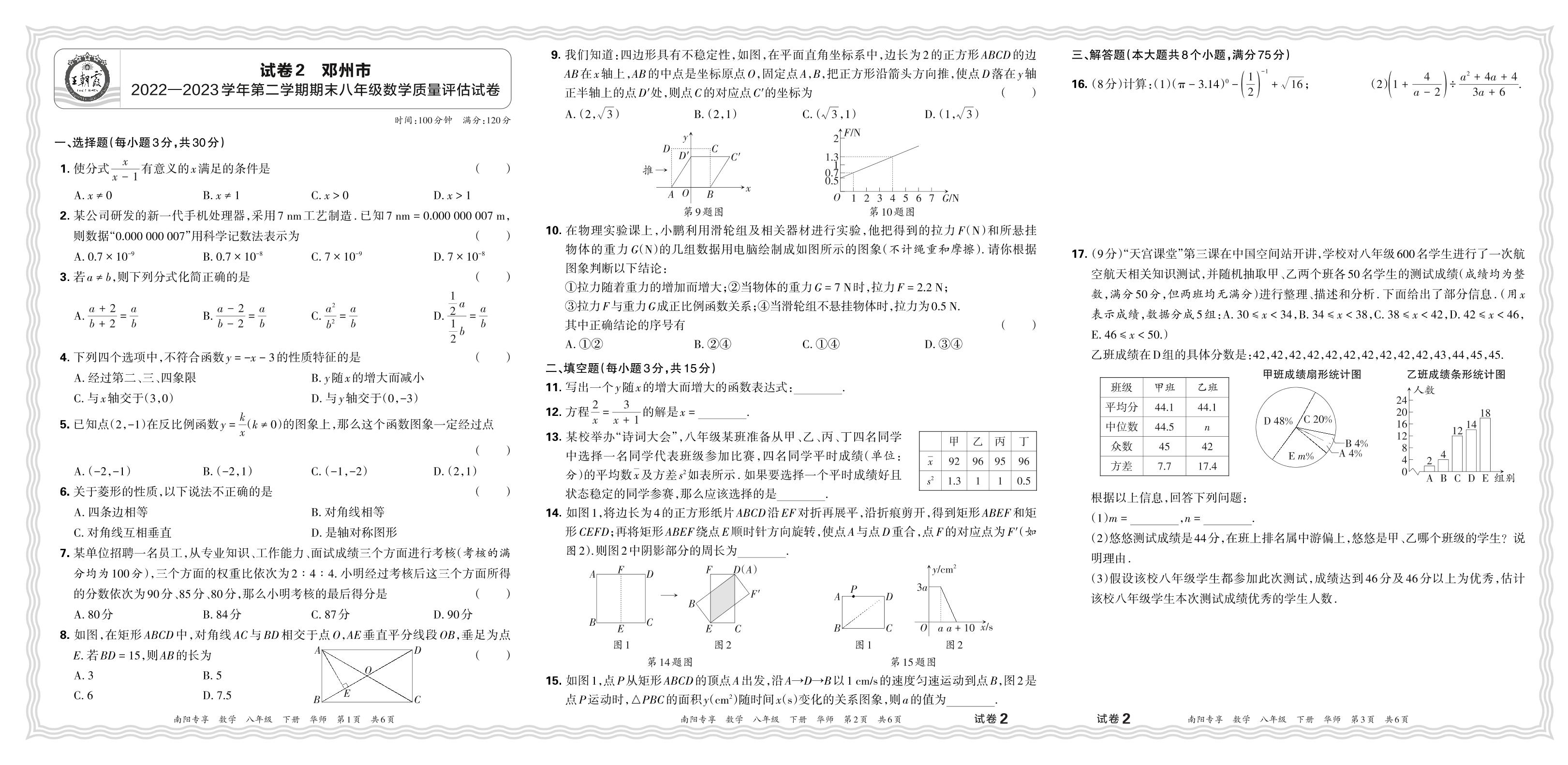 河南省南阳市邓州市2022-2023学年第二学期期末八年级数学质量评估试卷(华师版)【2】