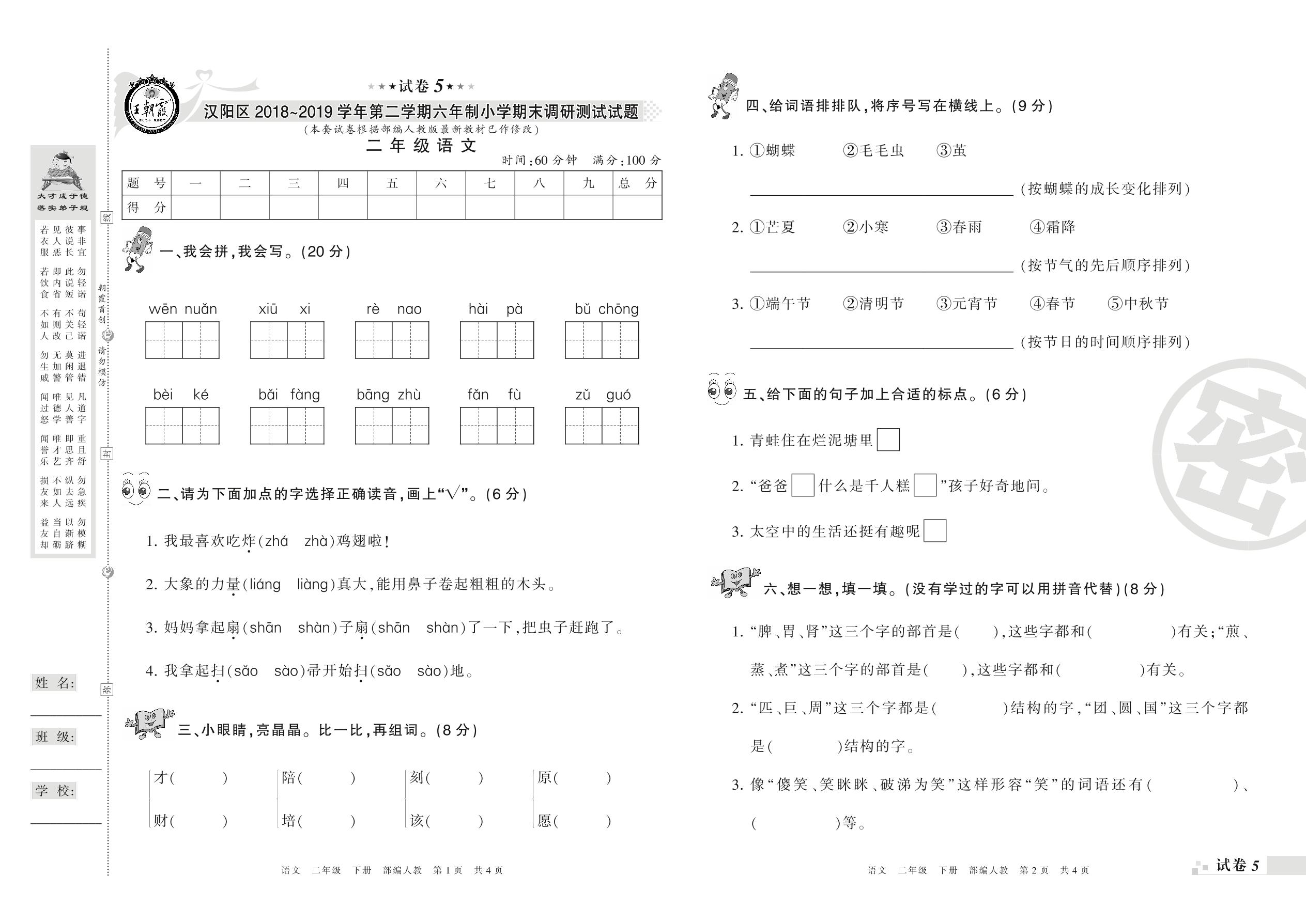 2018-2019学年第二学期武汉市汉阳区二年级语文试卷(人教版)【5】