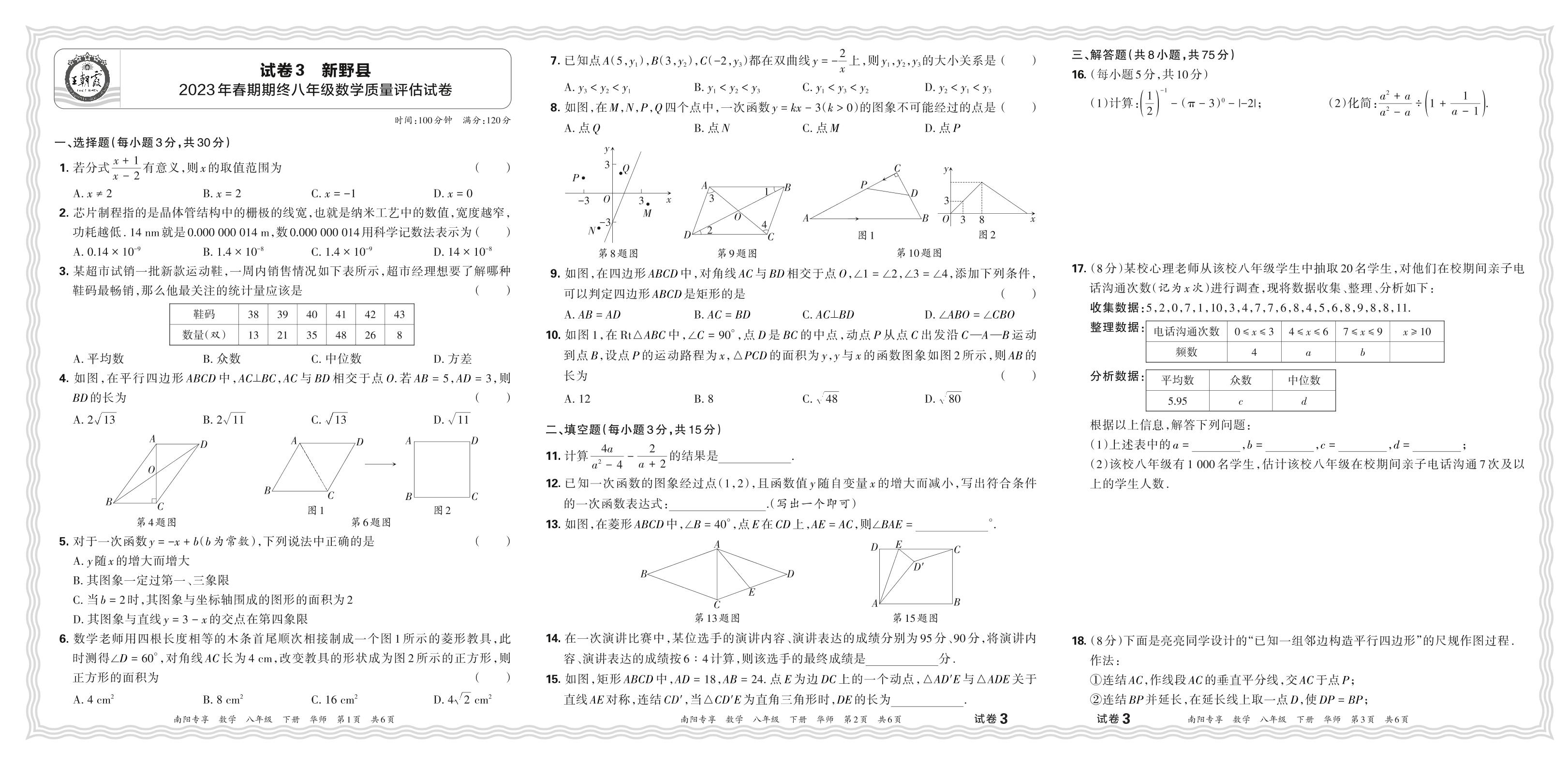 河南省南阳市新野县2023年春期期终八年级数学质量评估试卷(华师版)【3】