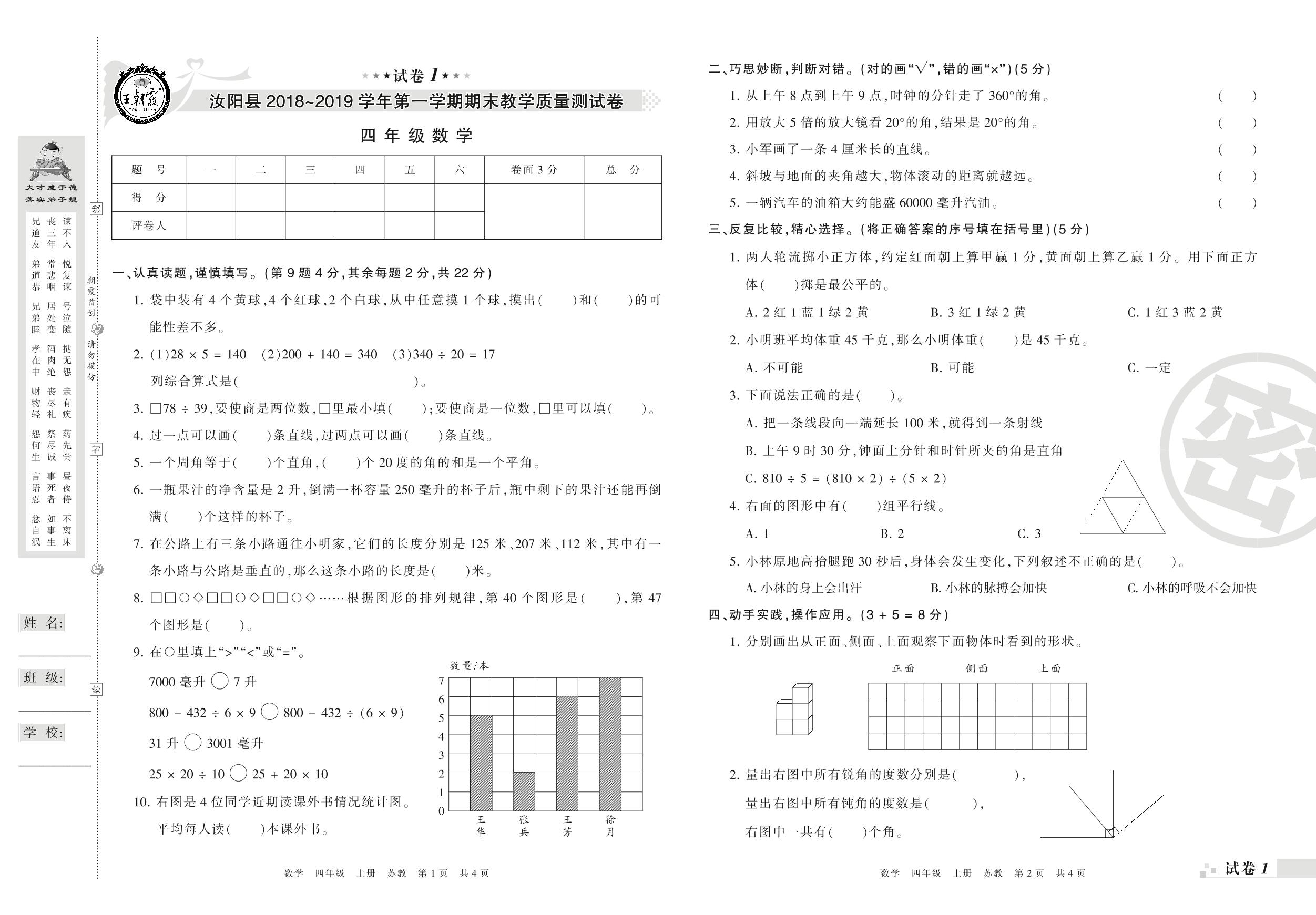 2018-2019学年第一学期洛阳市汝阳县四年级数学试卷(苏教版)【1】