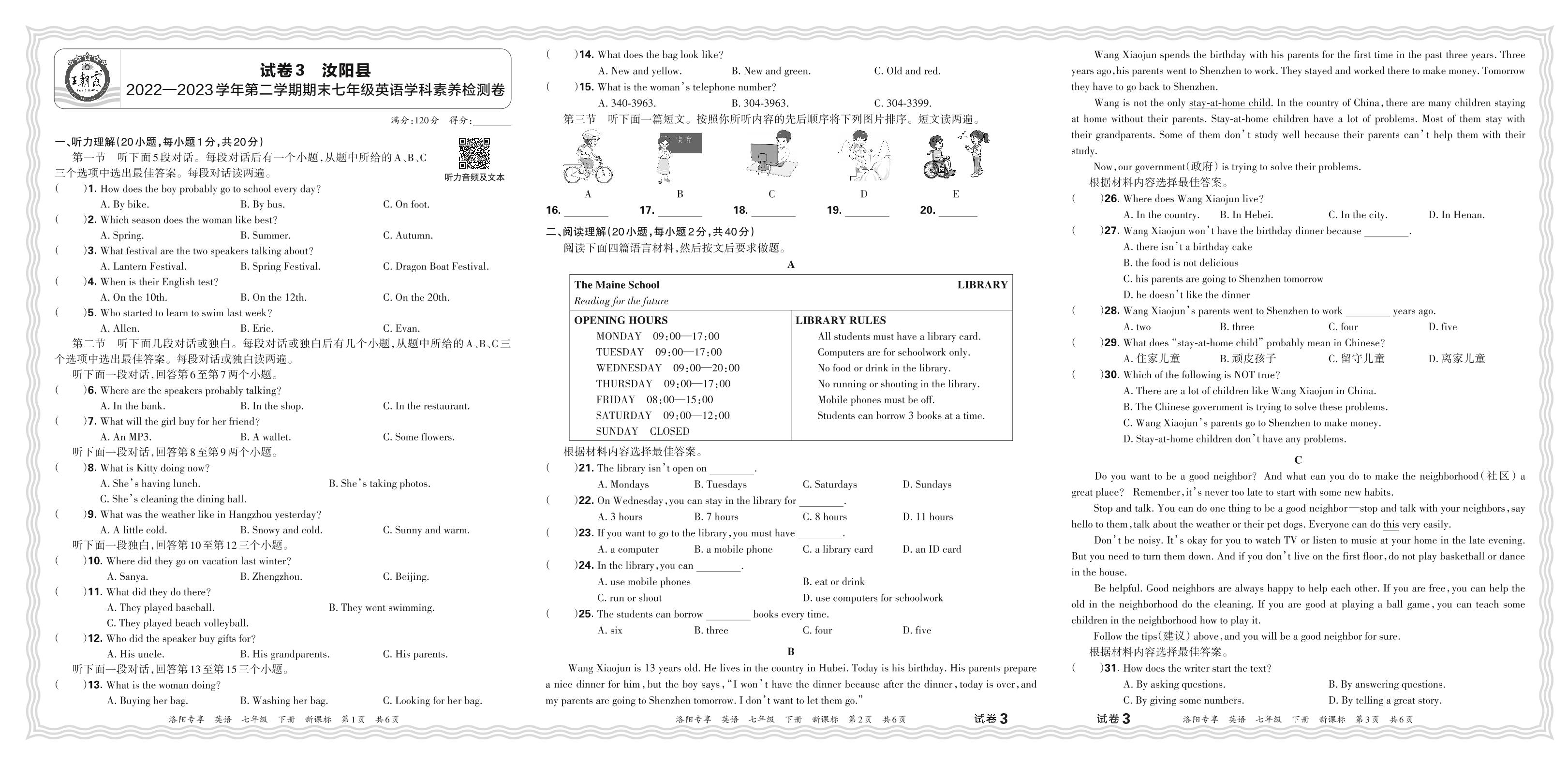 河南省洛阳市汝阳县2022-2023学年第二学期期末七年级英语学科素养检测卷(新课标版)【3】