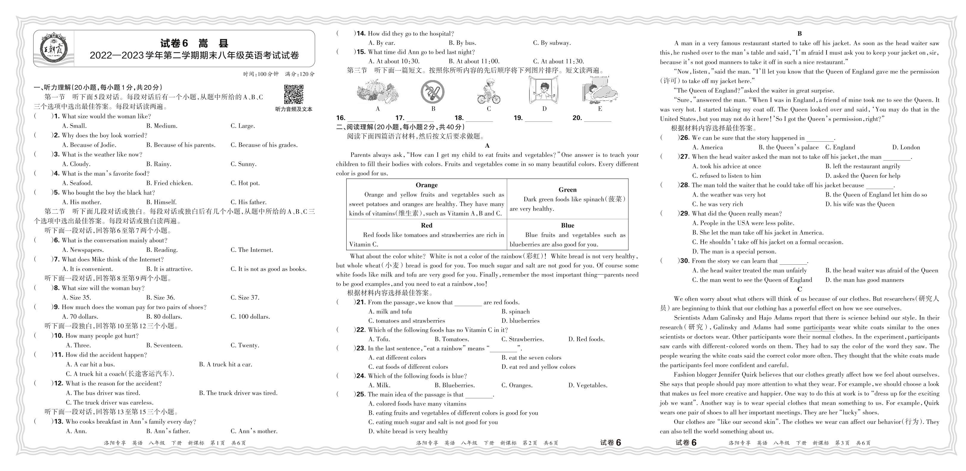 河南省洛阳市嵩县2022-2023学年第二学期期末八年级英语考试试卷(新课标版)【6】