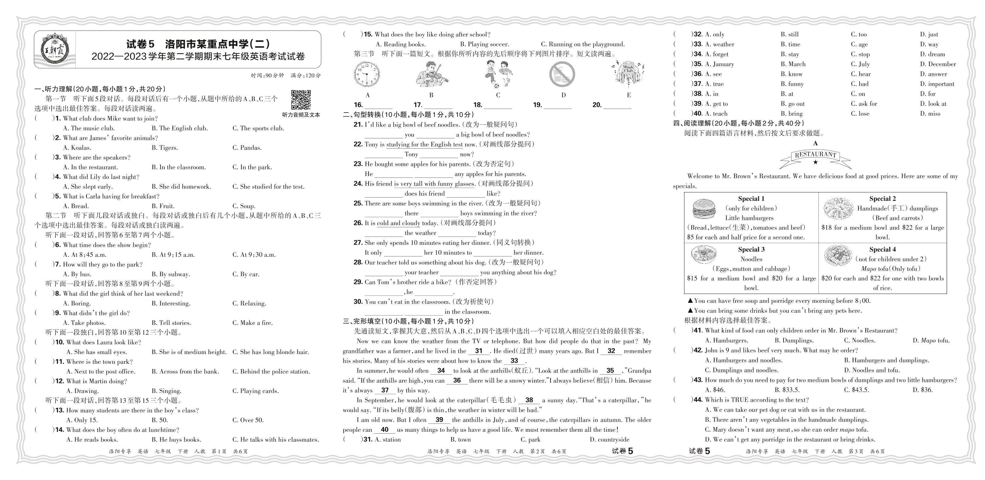 河南省洛阳市某重点中学(二)2022-2023学年第二学期期末七年级英语考试试卷(人教版)【5】