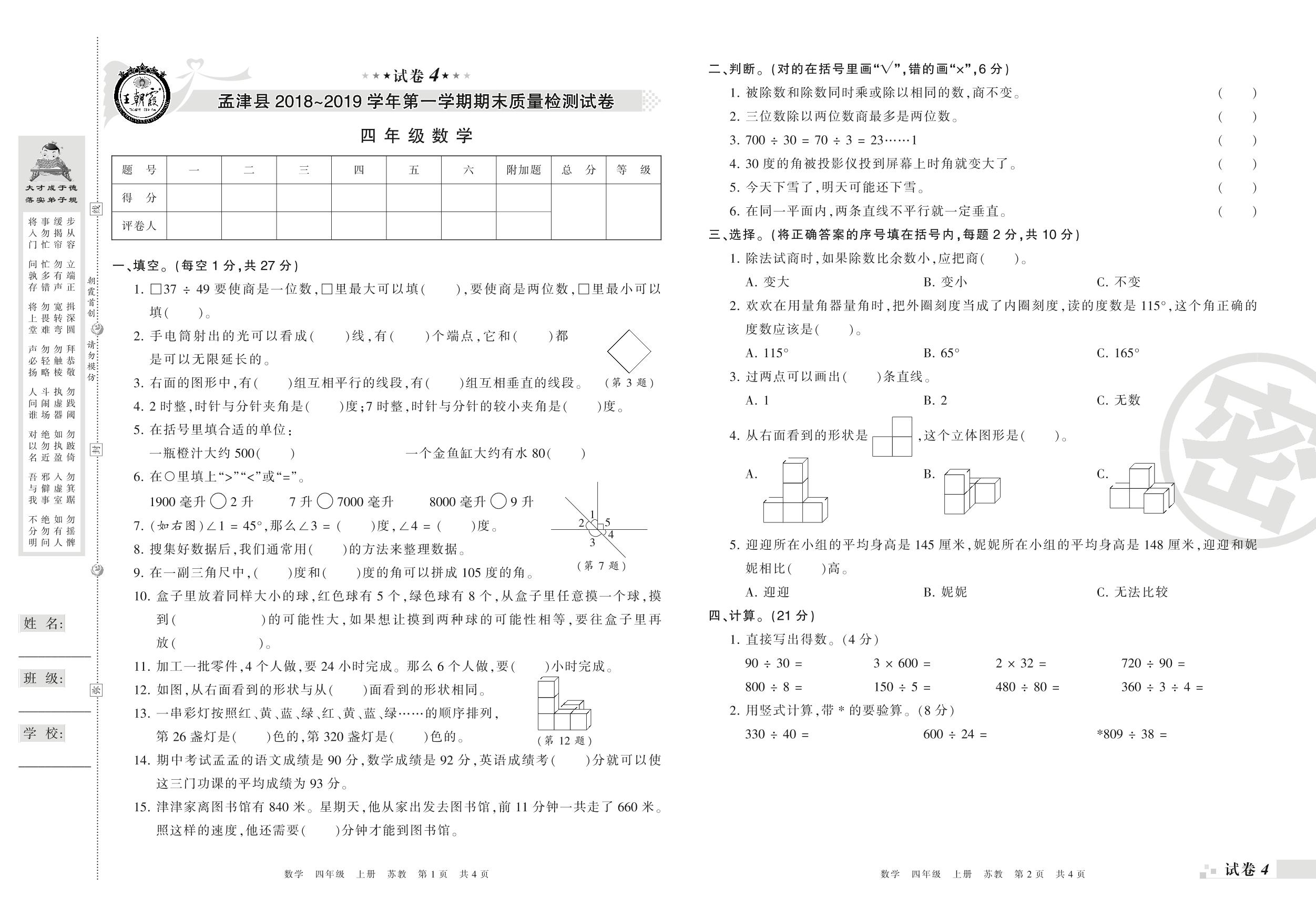 2018-2019学年第一学期洛阳市孟津县四年级数学试卷(苏教版)【4】