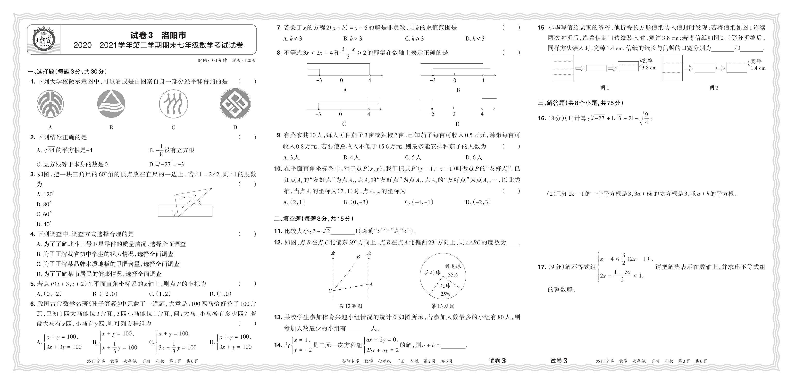 河南省洛阳市2020-2021学年第二学期期末七年级数学考试试卷(人教版)【3】