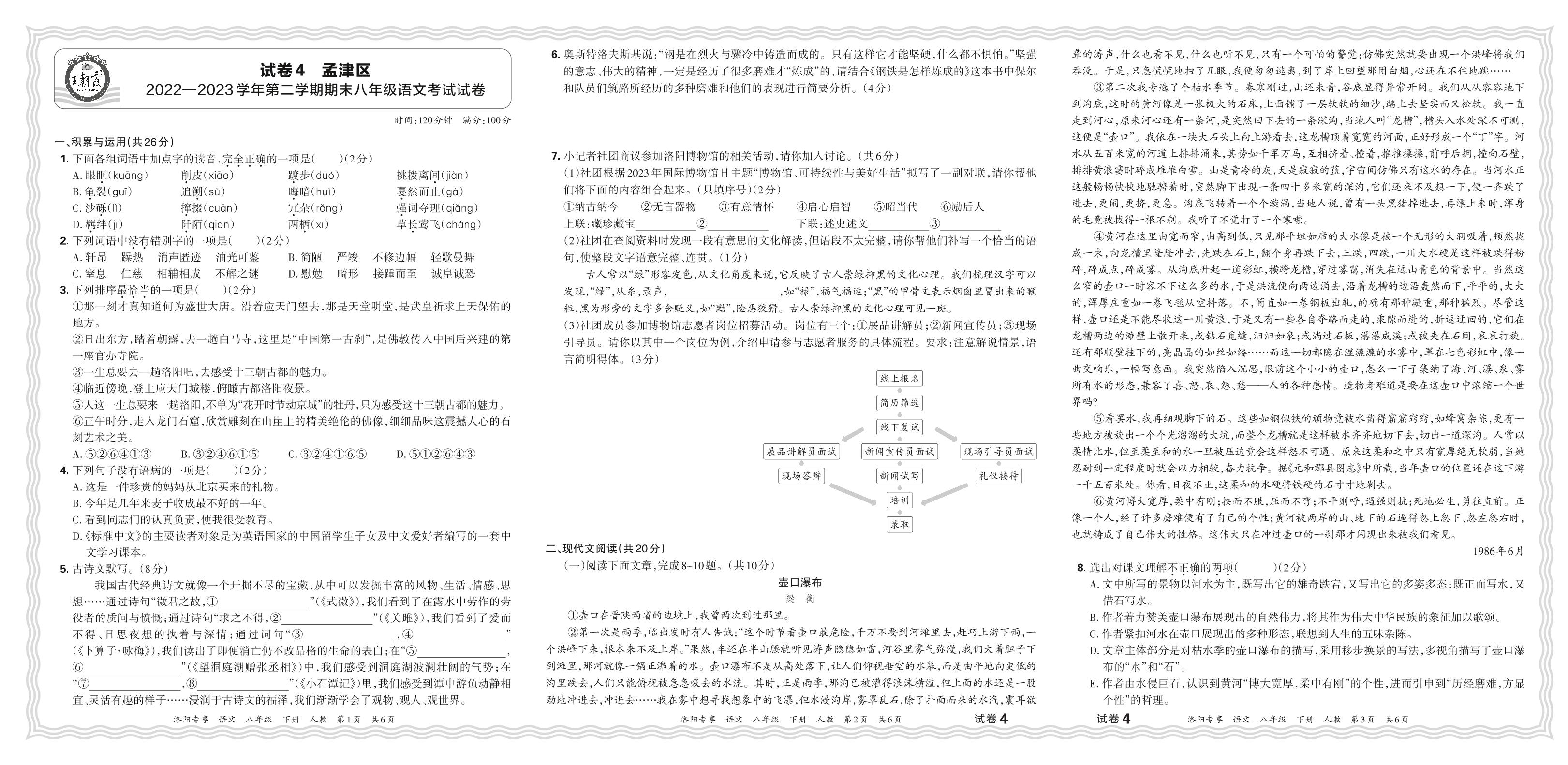 河南省洛阳市孟津区2022-2023学年第二学期期末八年级语文考试试卷(人教版)【4】