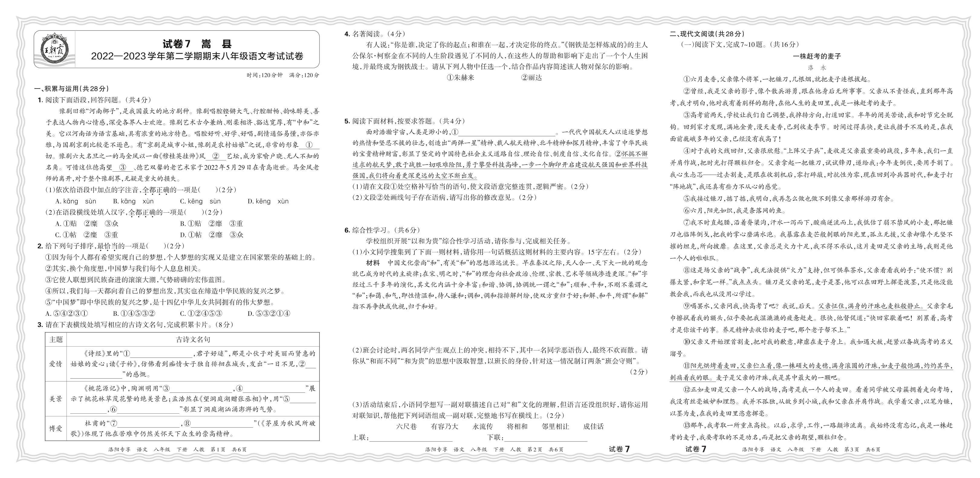 河南省洛阳市嵩县2022-2023学年第二学期期末八年级语文考试试卷(人教版)【7】