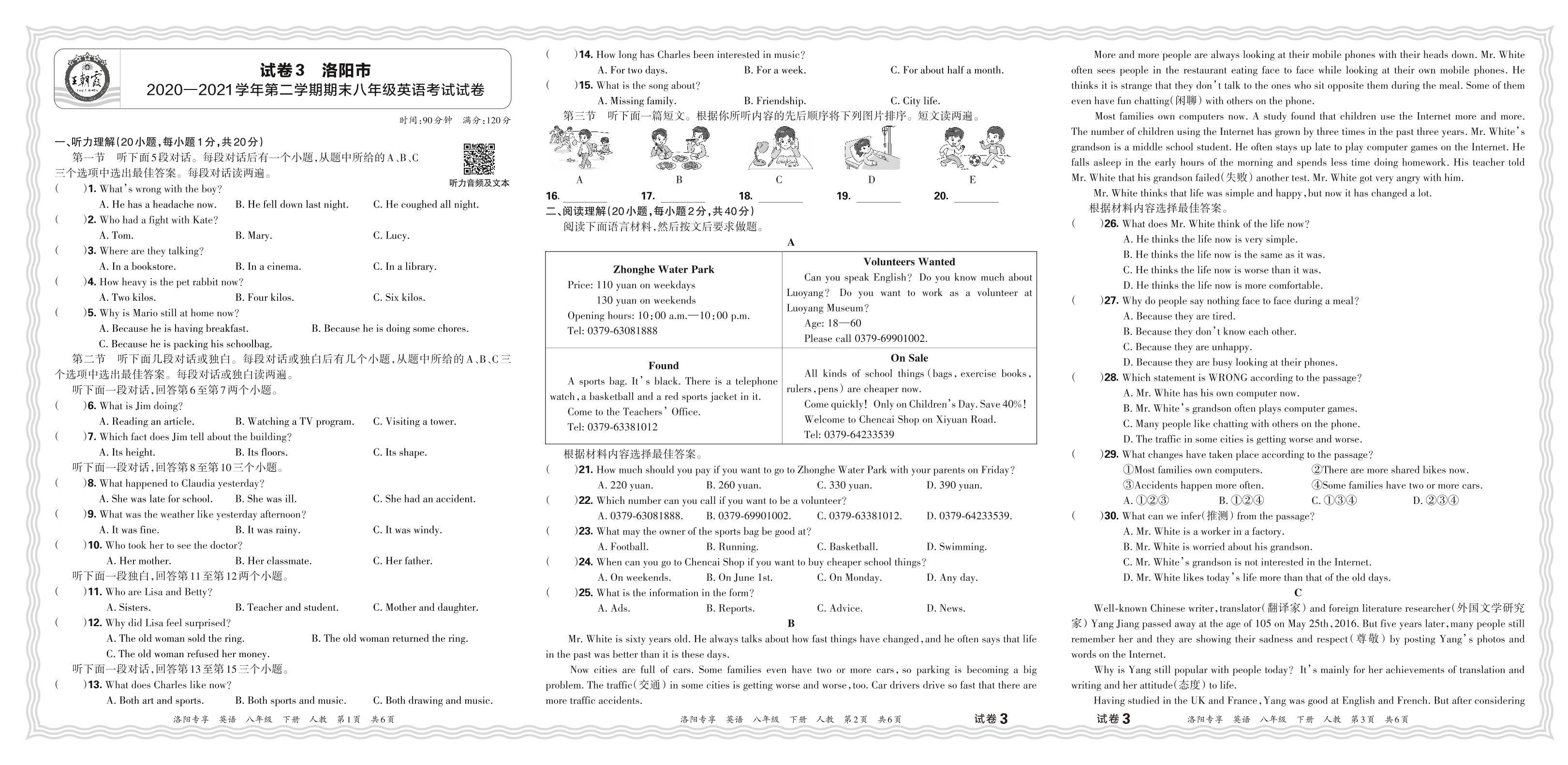 河南省洛阳市2020-2021学年第二学期期末八年级英语考试试卷(人教版)【3】