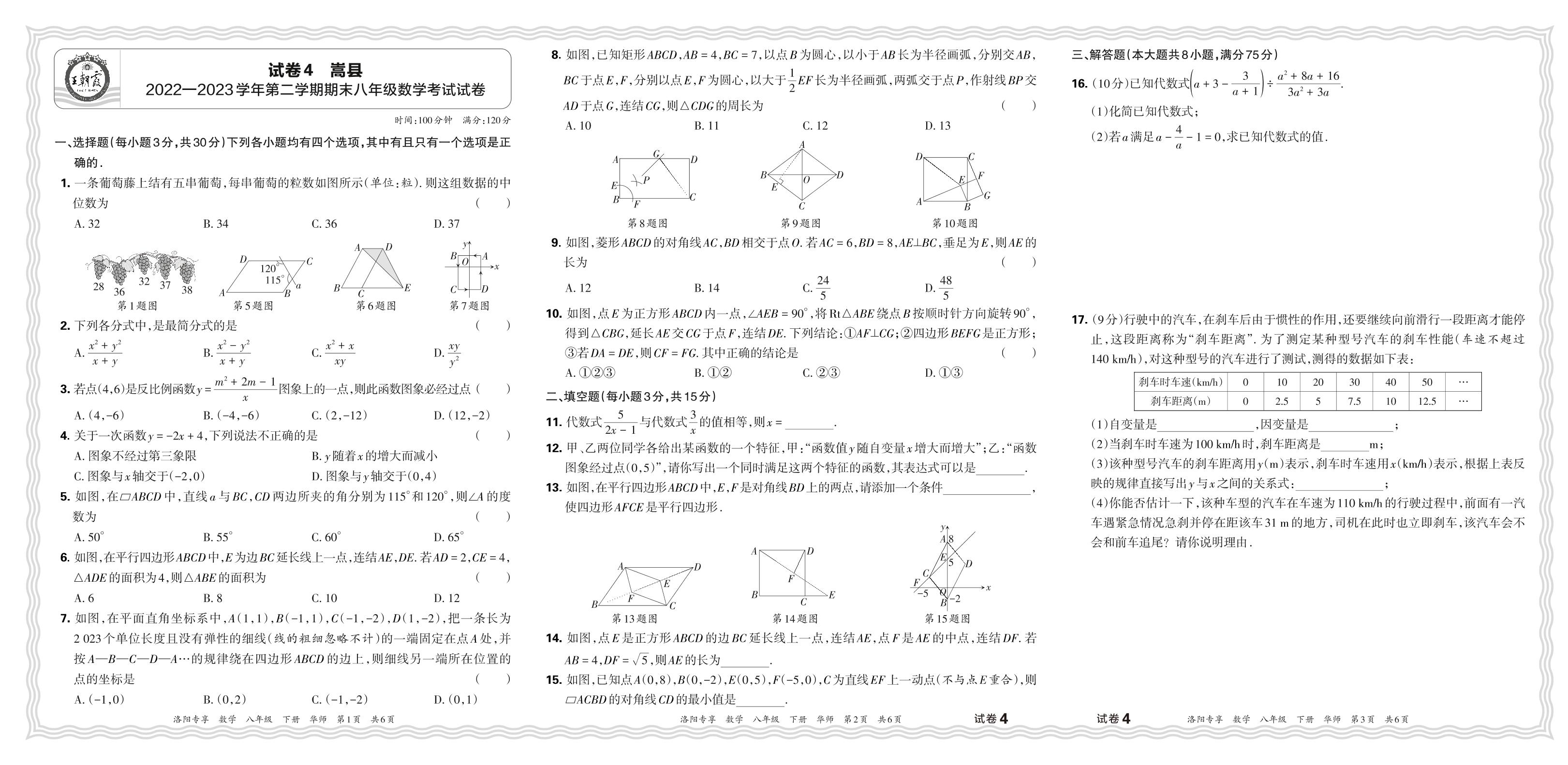 河南省洛阳市嵩县2022-2023学年第二学期期末八年级数学考试试卷(华师版)【4】