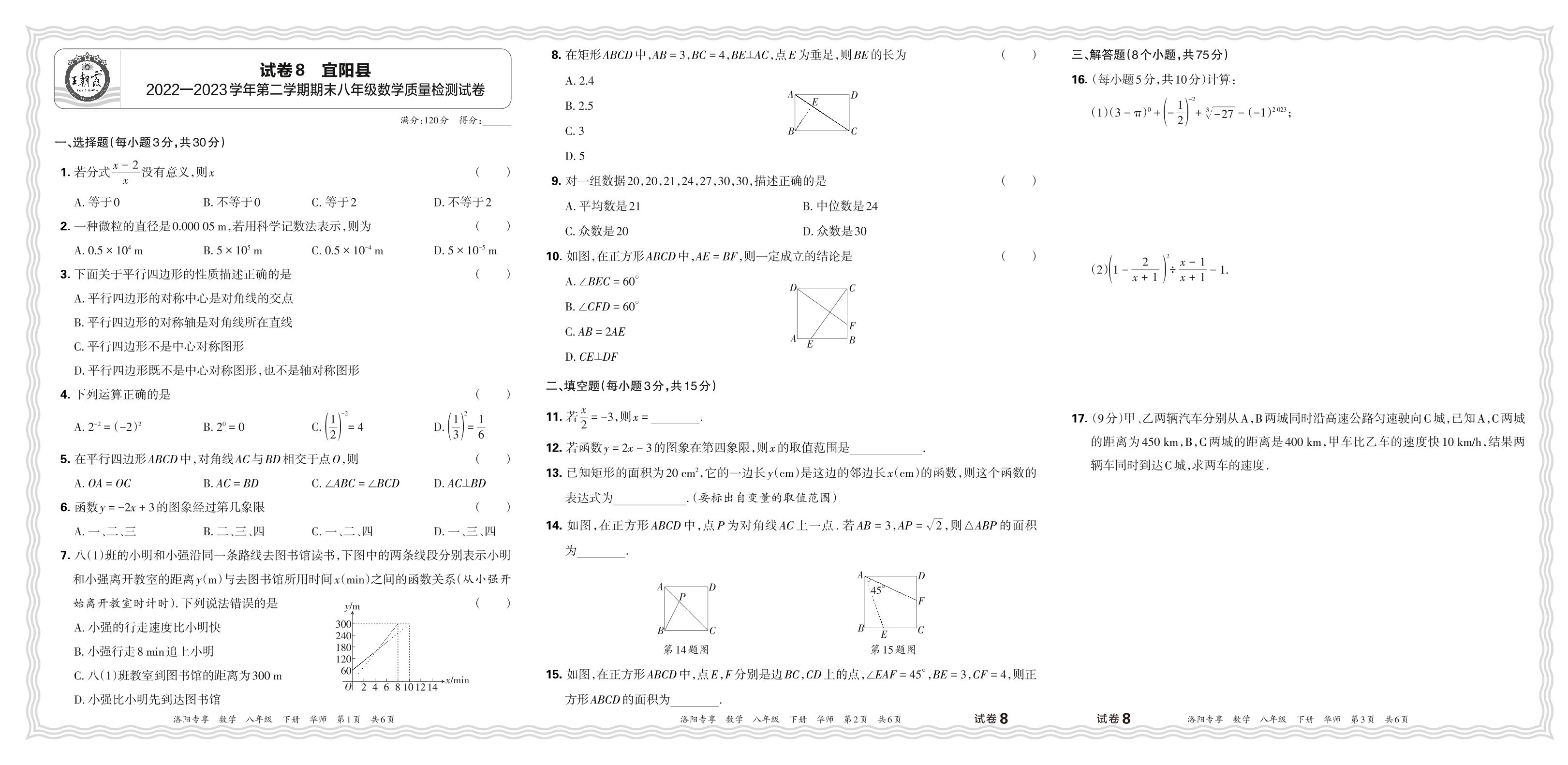 河南省洛阳市宜阳县2022-2023学年第二学期期末八年级数学质量检测试卷(华师版)【8】