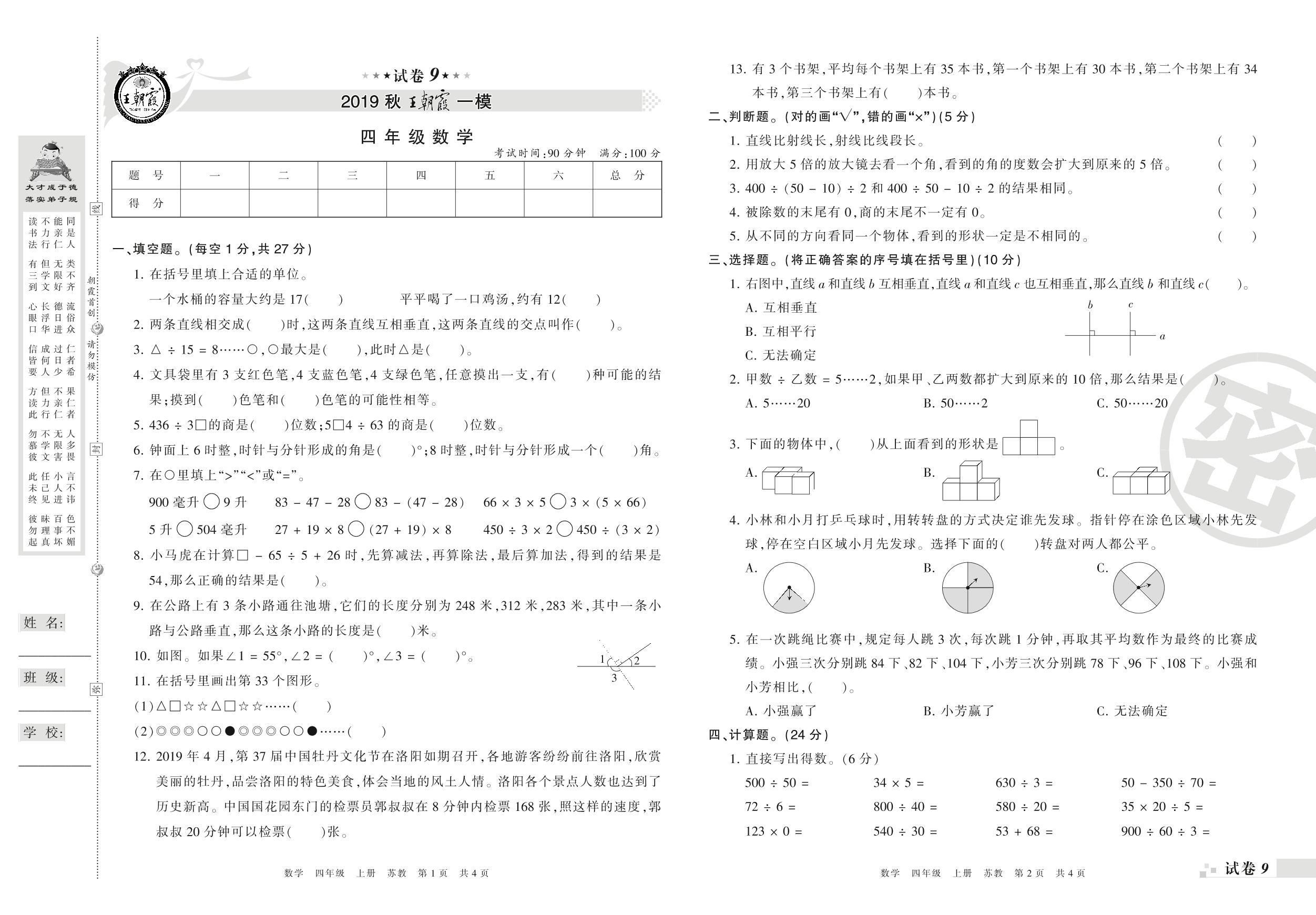 王朝霞期末模拟卷四年级上册数学(苏教版)_R210804144918【9】