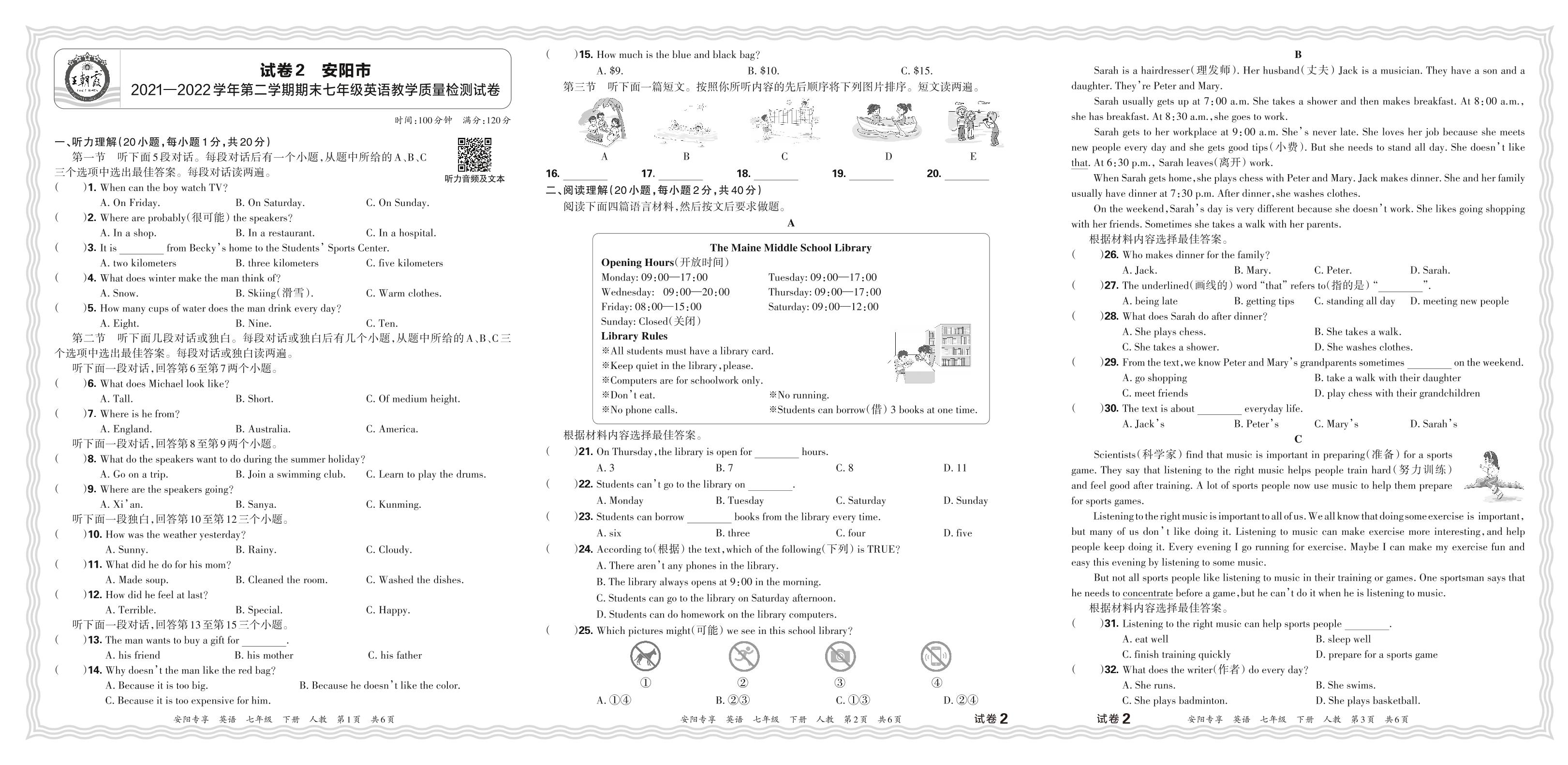 河南省安阳市2021-2022学年第二学期期末七年级英语教学质量检测试卷(人教版)【2】
