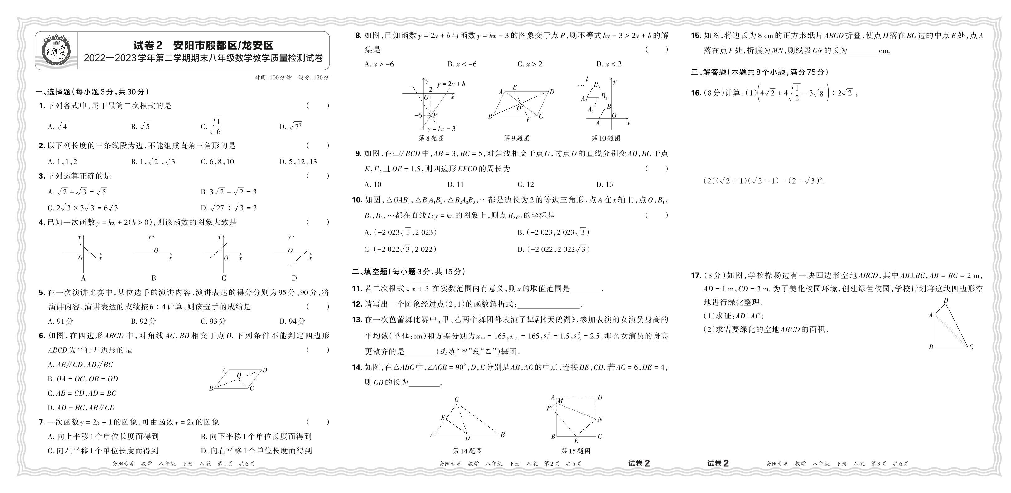 河南省安阳市殷都区、龙安区2022-2023学年第二学期期末八年级数学质量检测试卷(人教版)【2】
