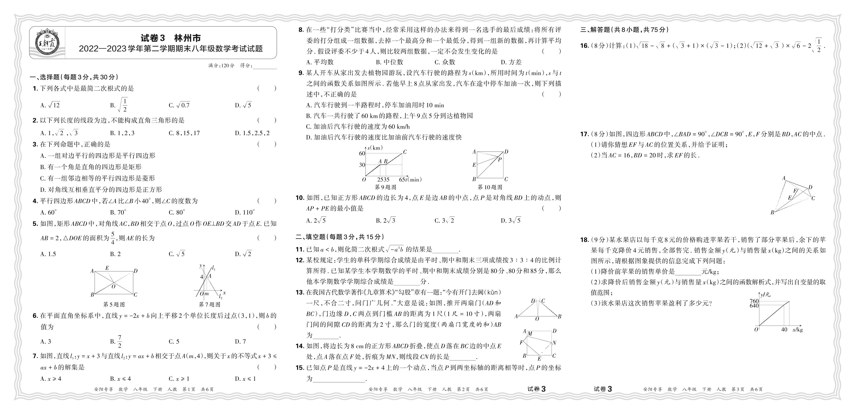 河南省安阳市林州市2022-2023学年第二学期期末八年级数学考试试题(人教版)【3】