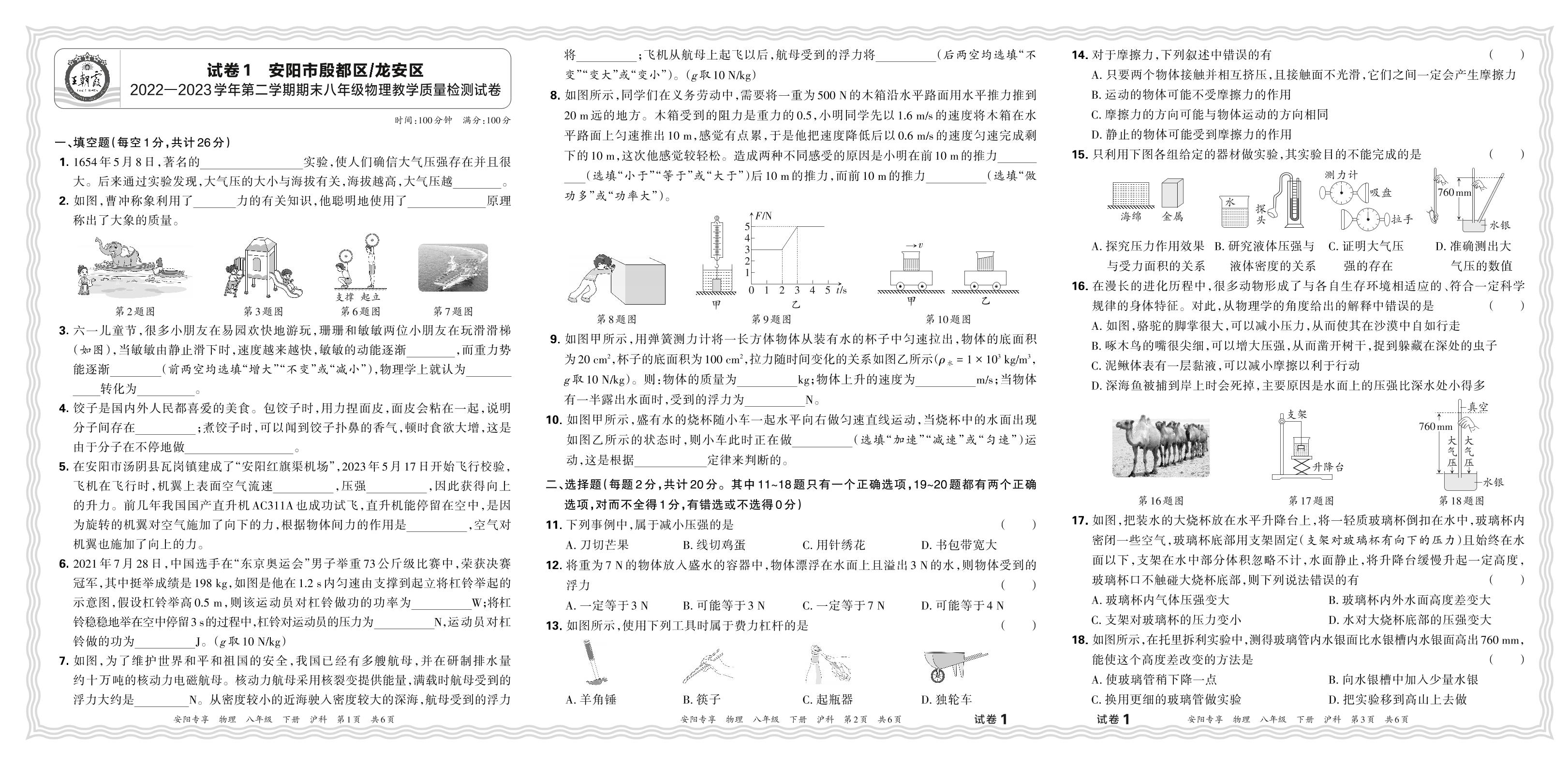 河南省安阳市殷都区、龙安区2022-2023学年第二学期期末八年级物理教学质量检测试卷(沪科版)【1】