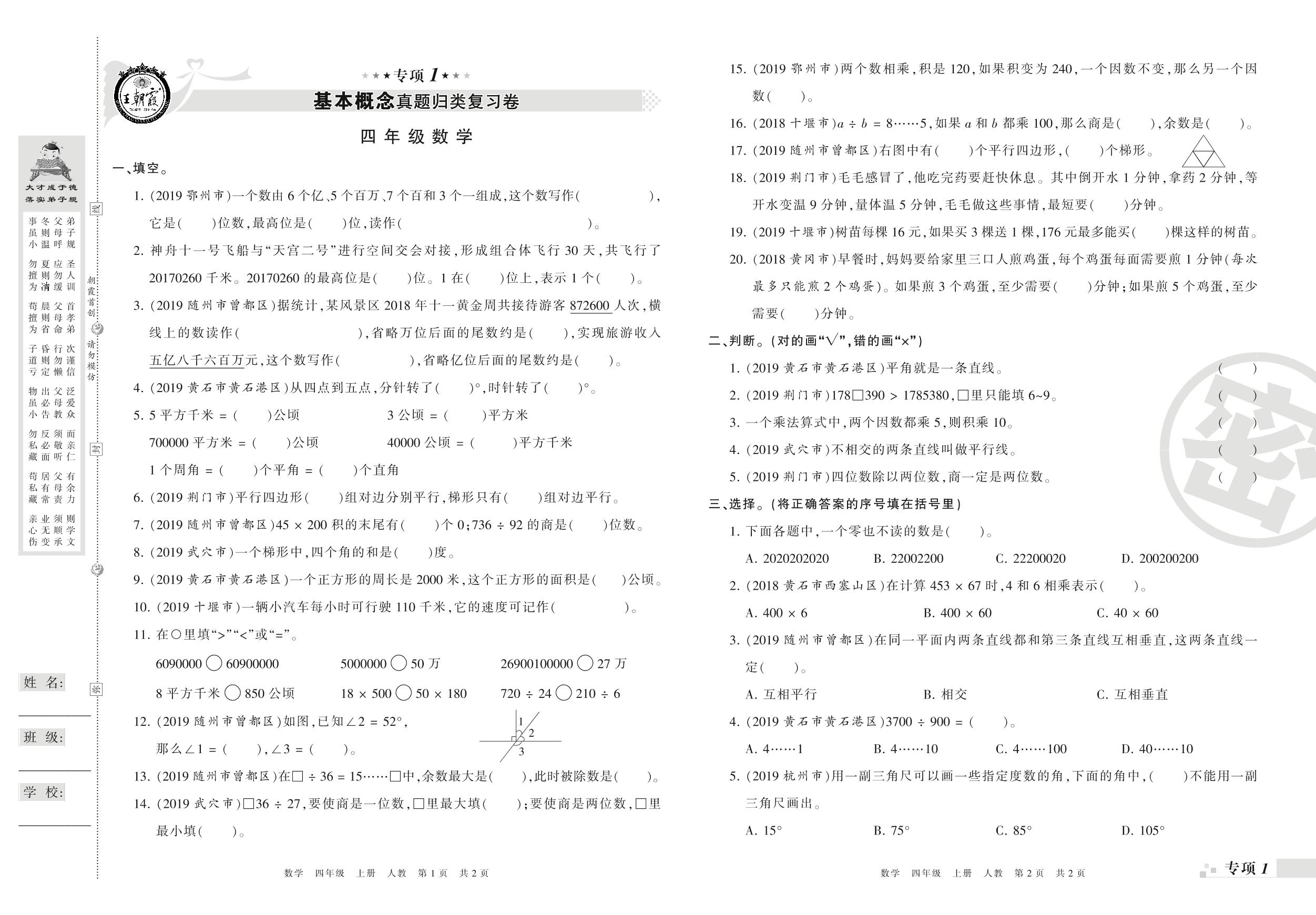 王朝霞期末专项卷——基本概念、计算真题归类复习四年级上册数学(人教版)_R210804144930【0】