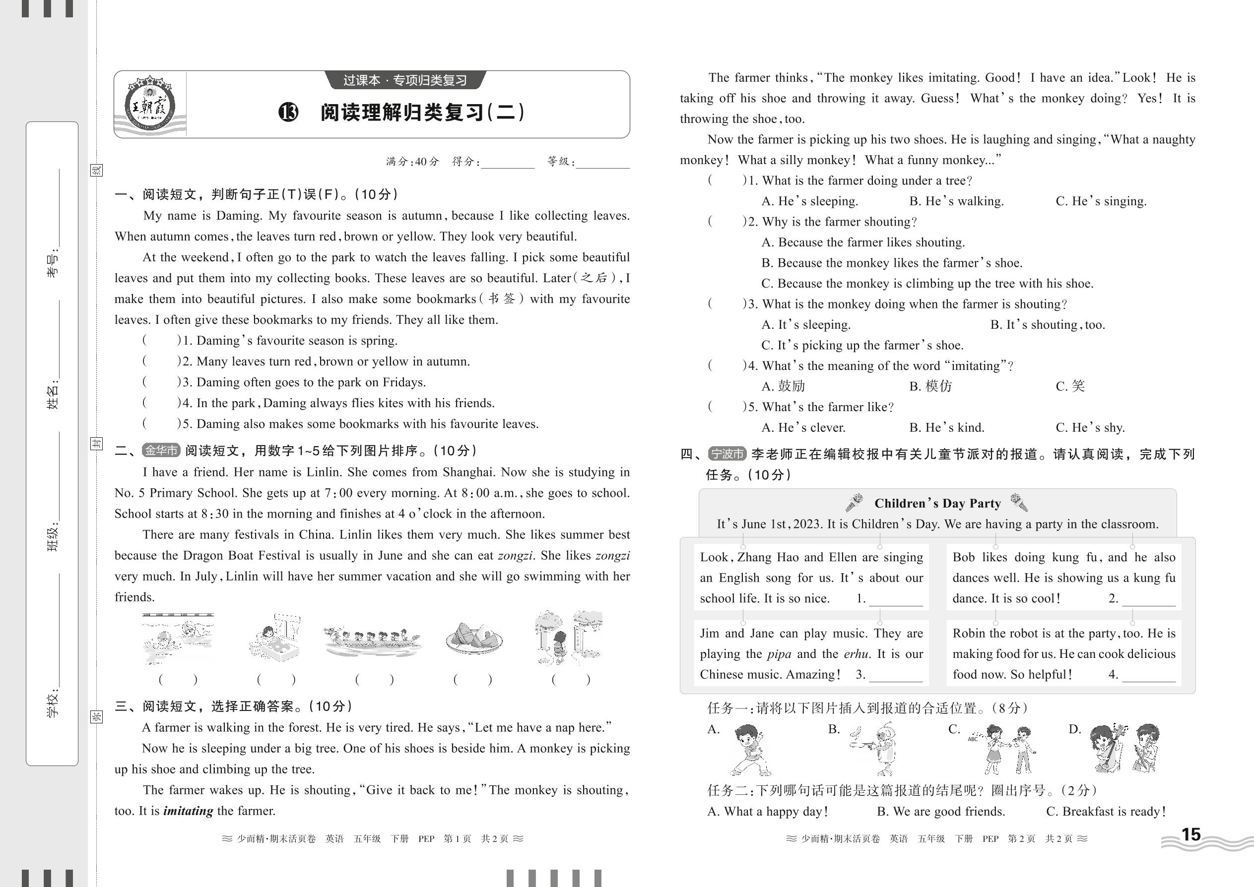 2024下册五年级英语人教PEP版 期末过课本HY版·阅读理解归类复习(二)_R240427162529207
