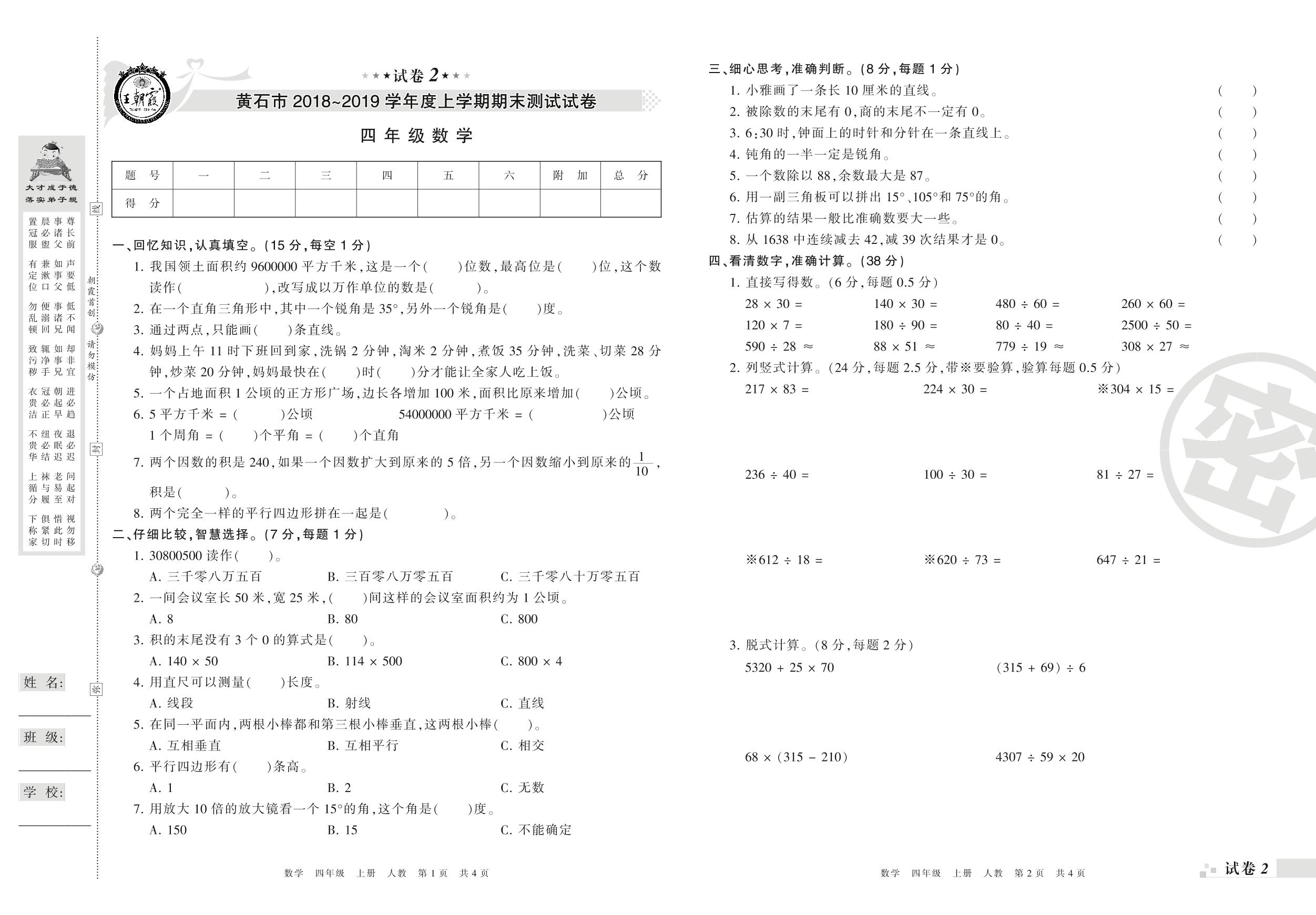 2018-2019学年第一学期黄石市四年级数学试卷(人教版)【2】