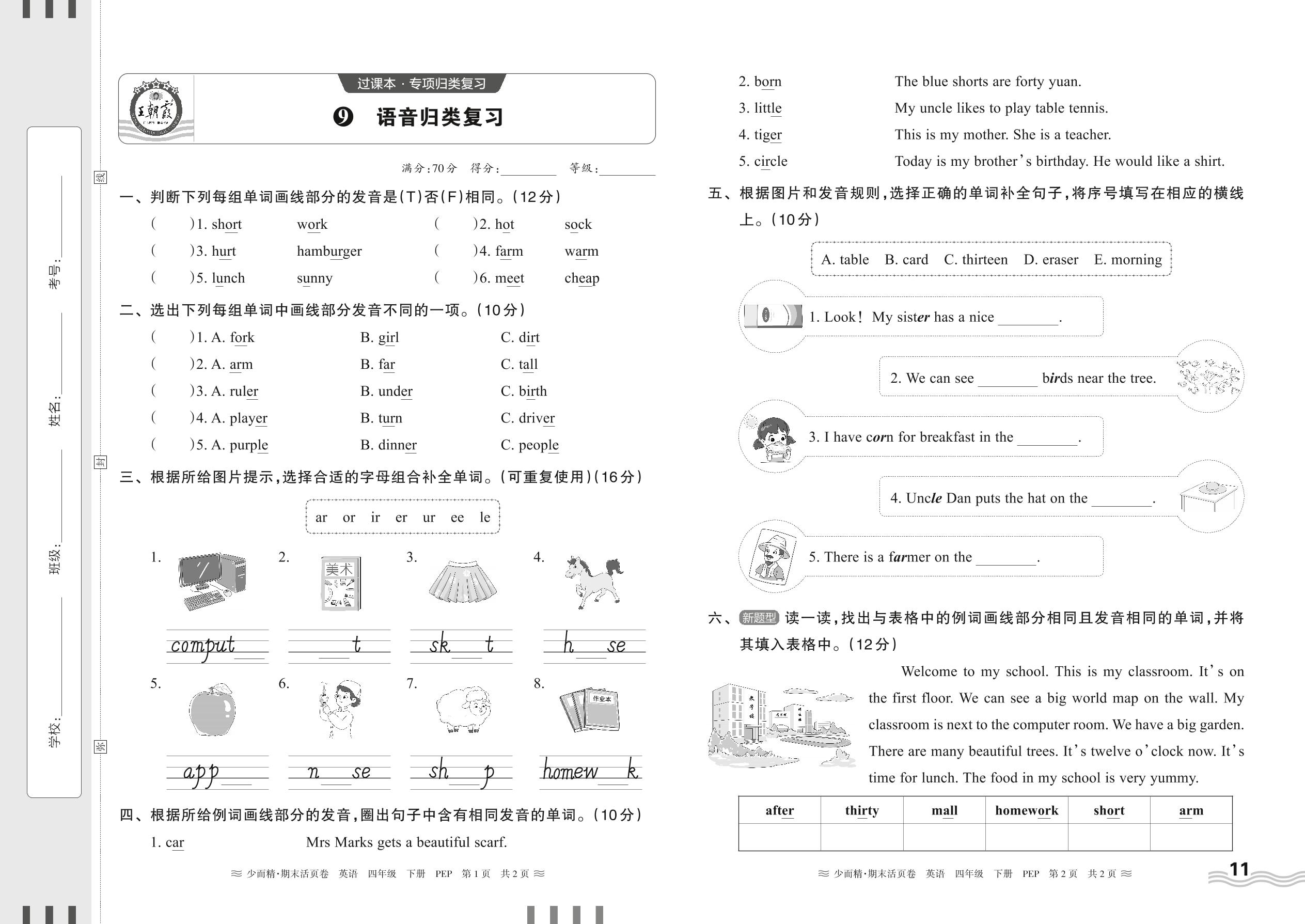 2024下册四年级英语人教PEP版 期末过课本HY版·语音归类复习