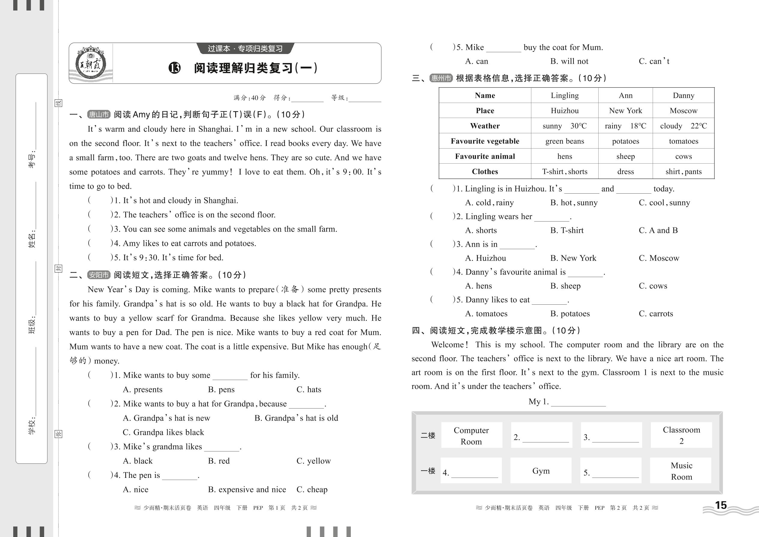 2024下册四年级英语人教PEP版 期末过课本HY版·阅读理解归类复习(一)