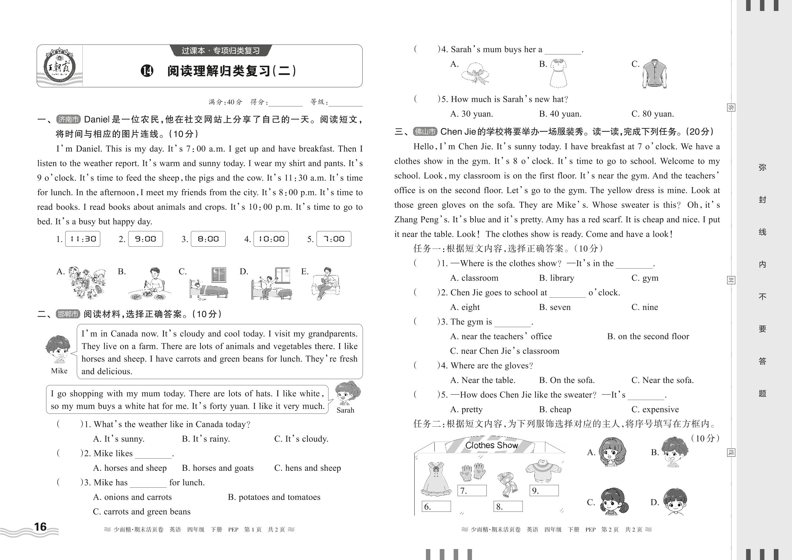 2024下册四年级英语人教PEP版 期末过课本HY版·阅读理解归类复习(二)