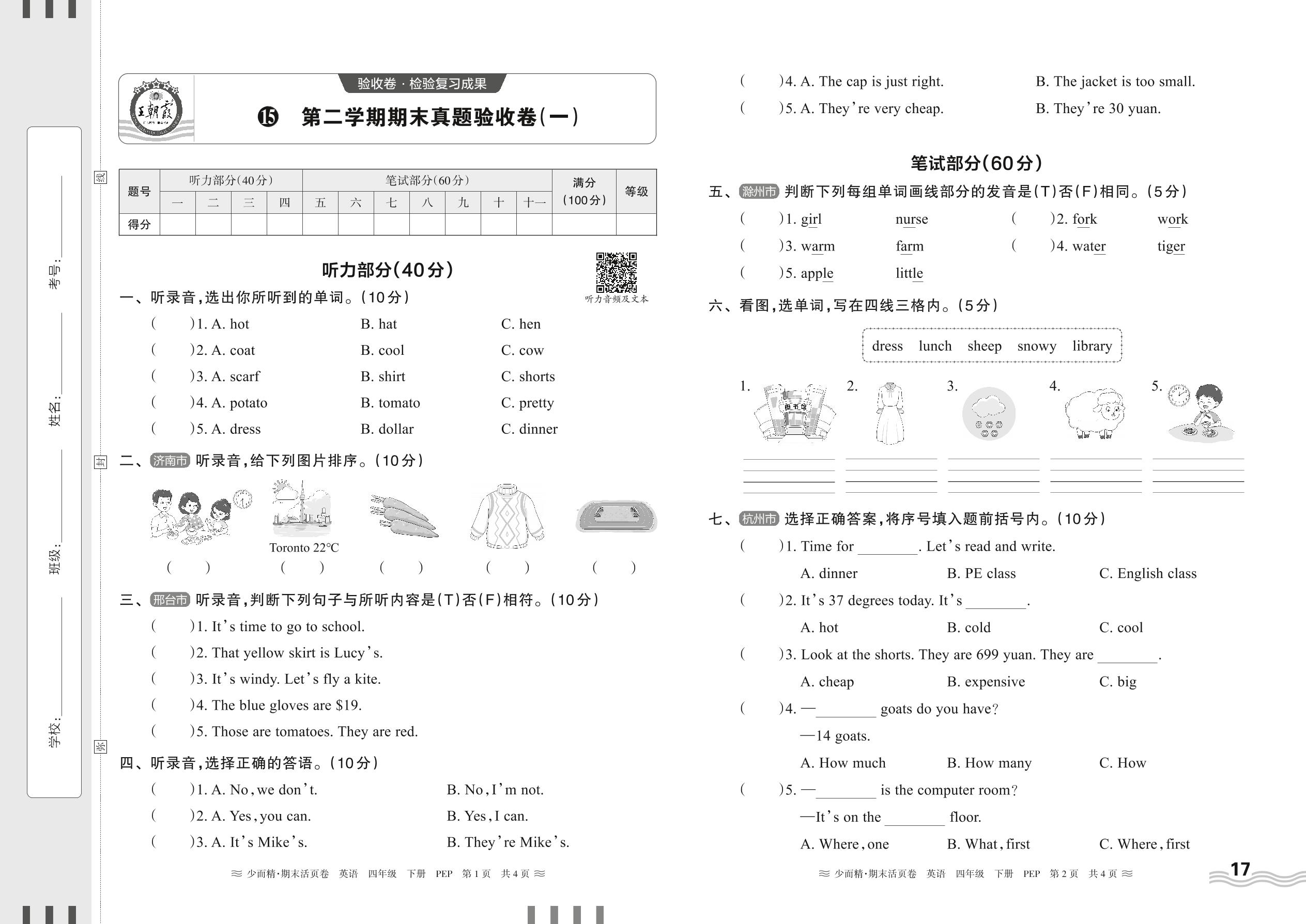 2024下册四年级英语人教PEP版 第二学期期末真题验收卷(一)