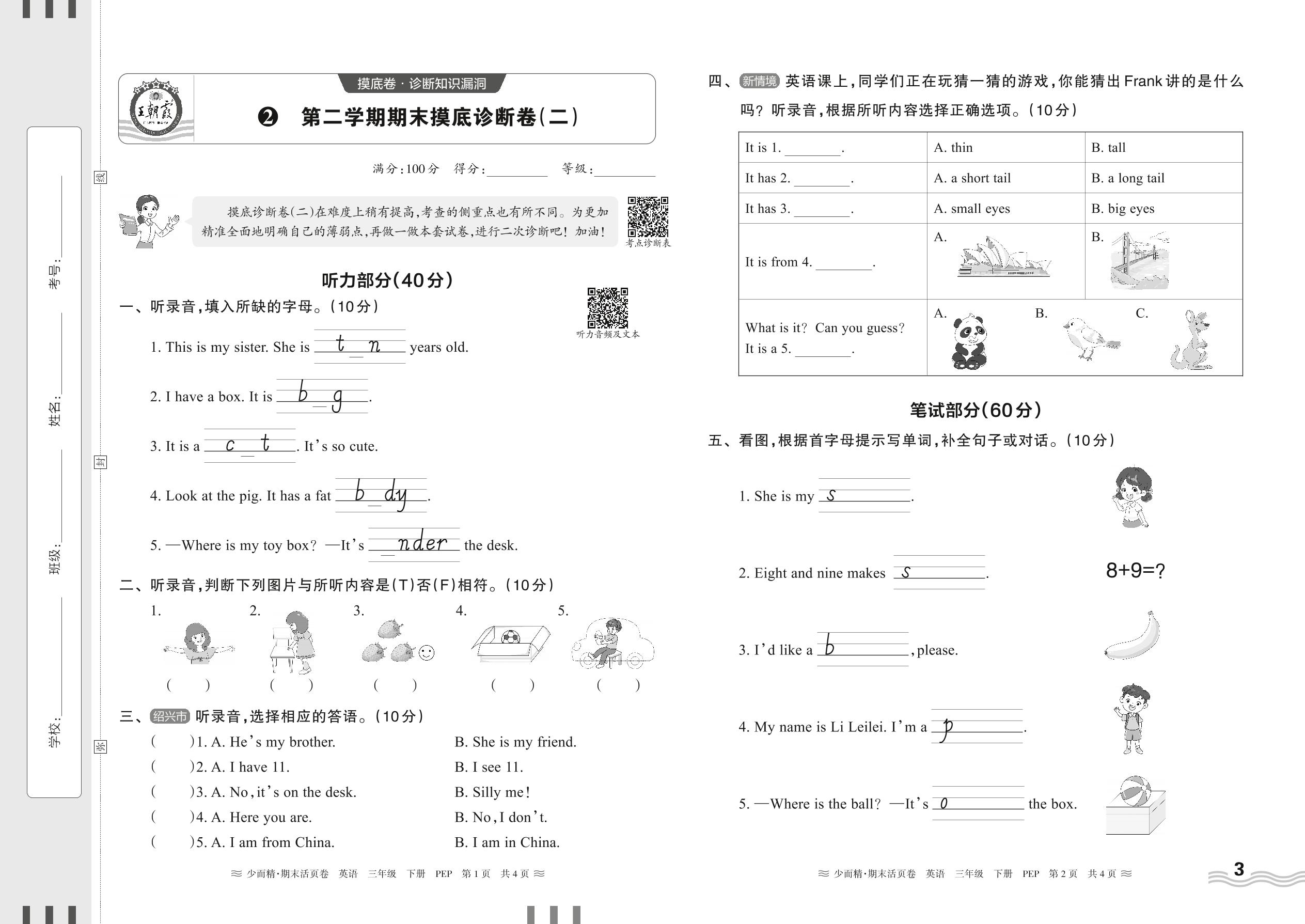 2024下册三年级英语人教PEP版 第二学期期末摸底诊断卷(二)