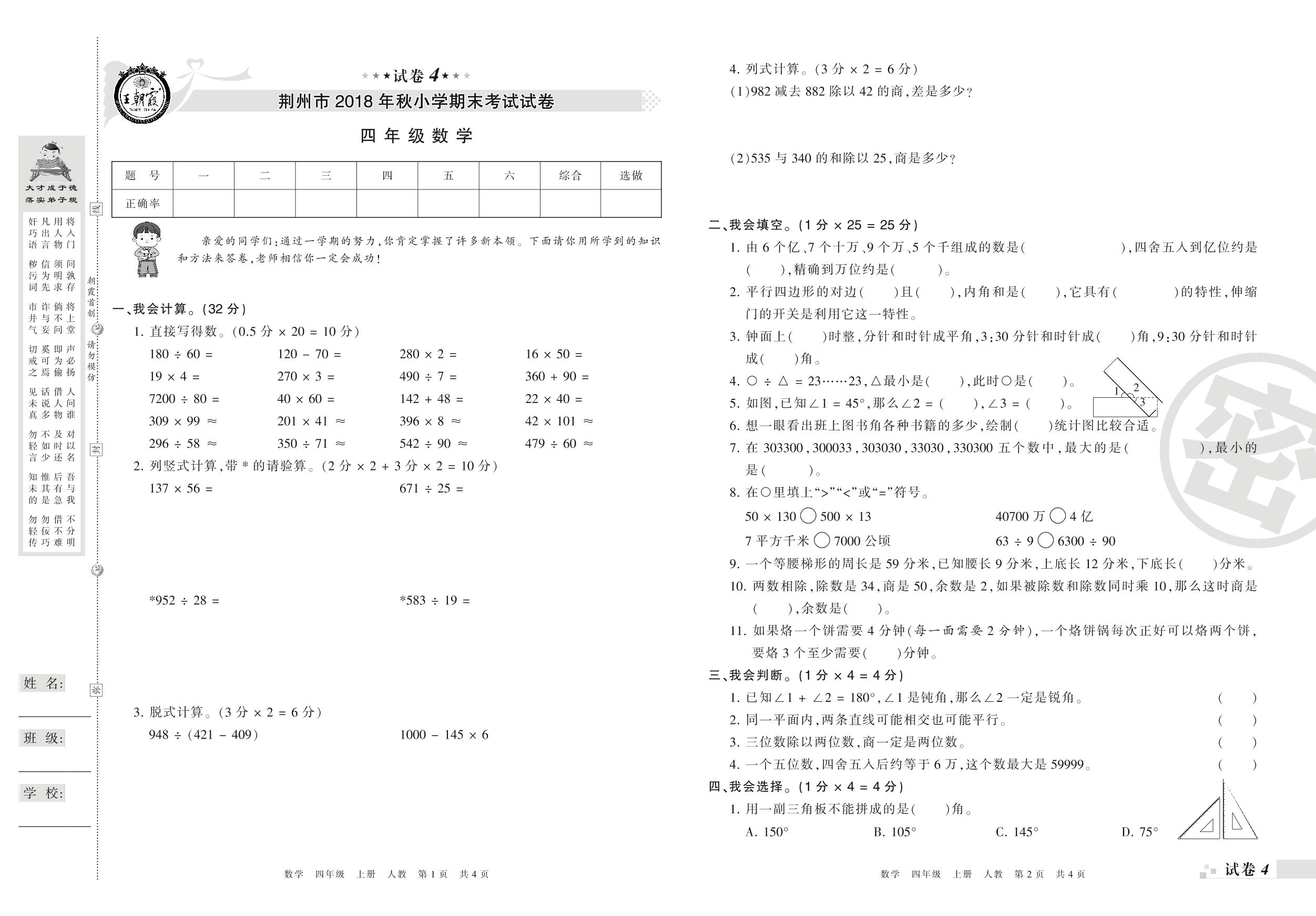 2018-2019学年第一学期荆州市四年级数学试卷(人教版)【4】