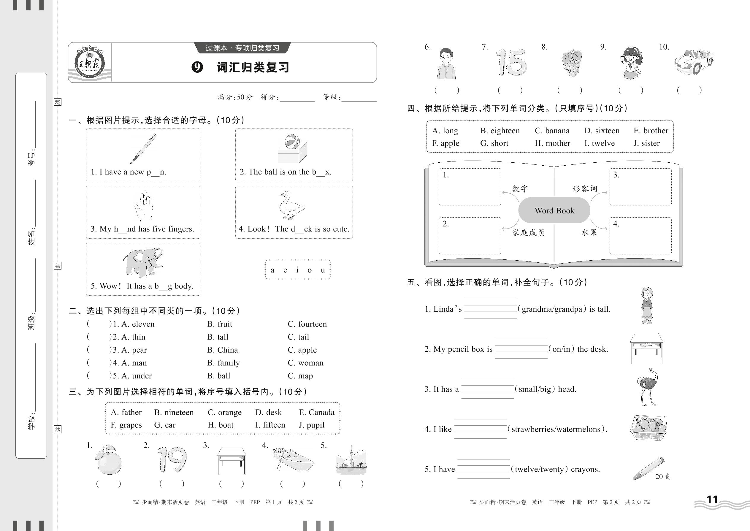 2024下册三年级英语人教PEP版 期末过课本HY版·词汇归类复习