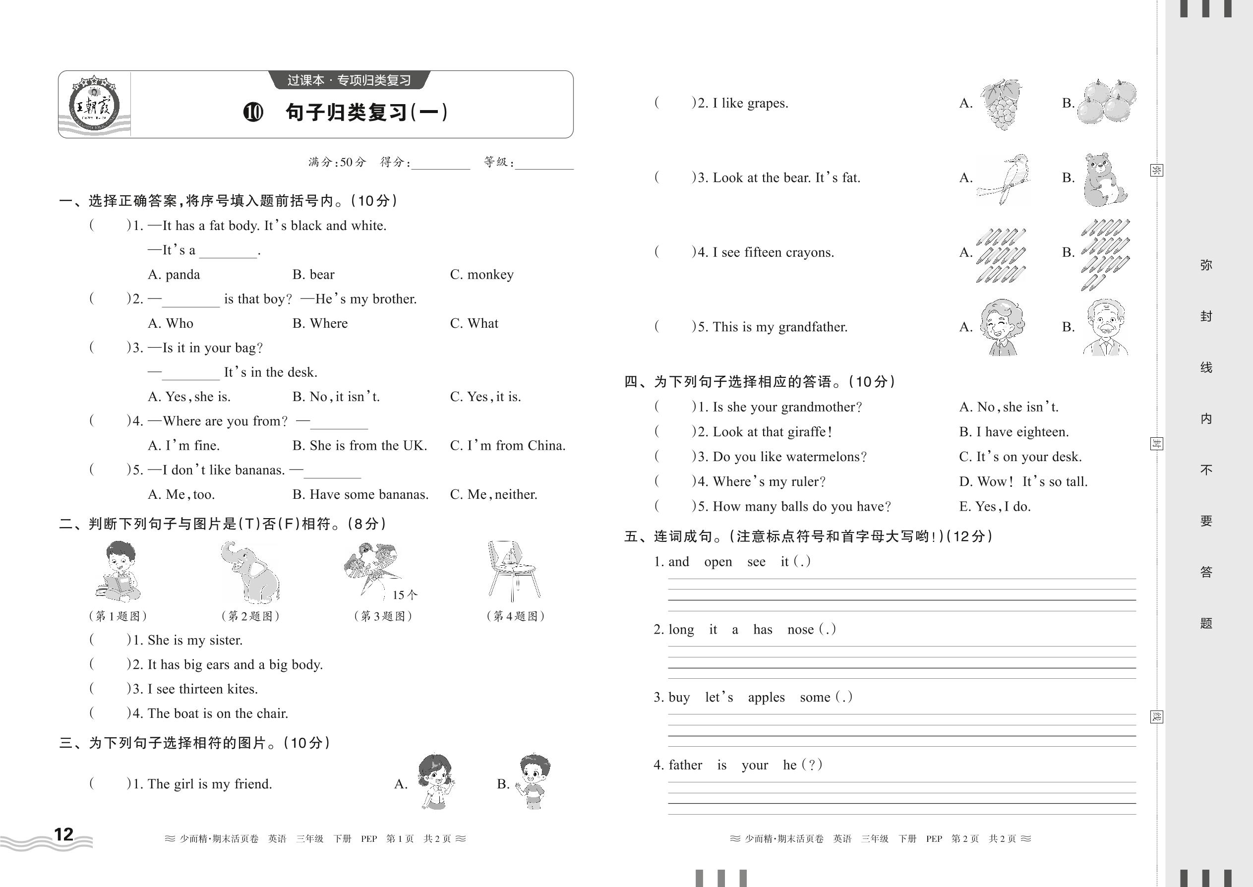 2024下册三年级英语人教PEP版 期末过课本HY版·句子归类复习(一)