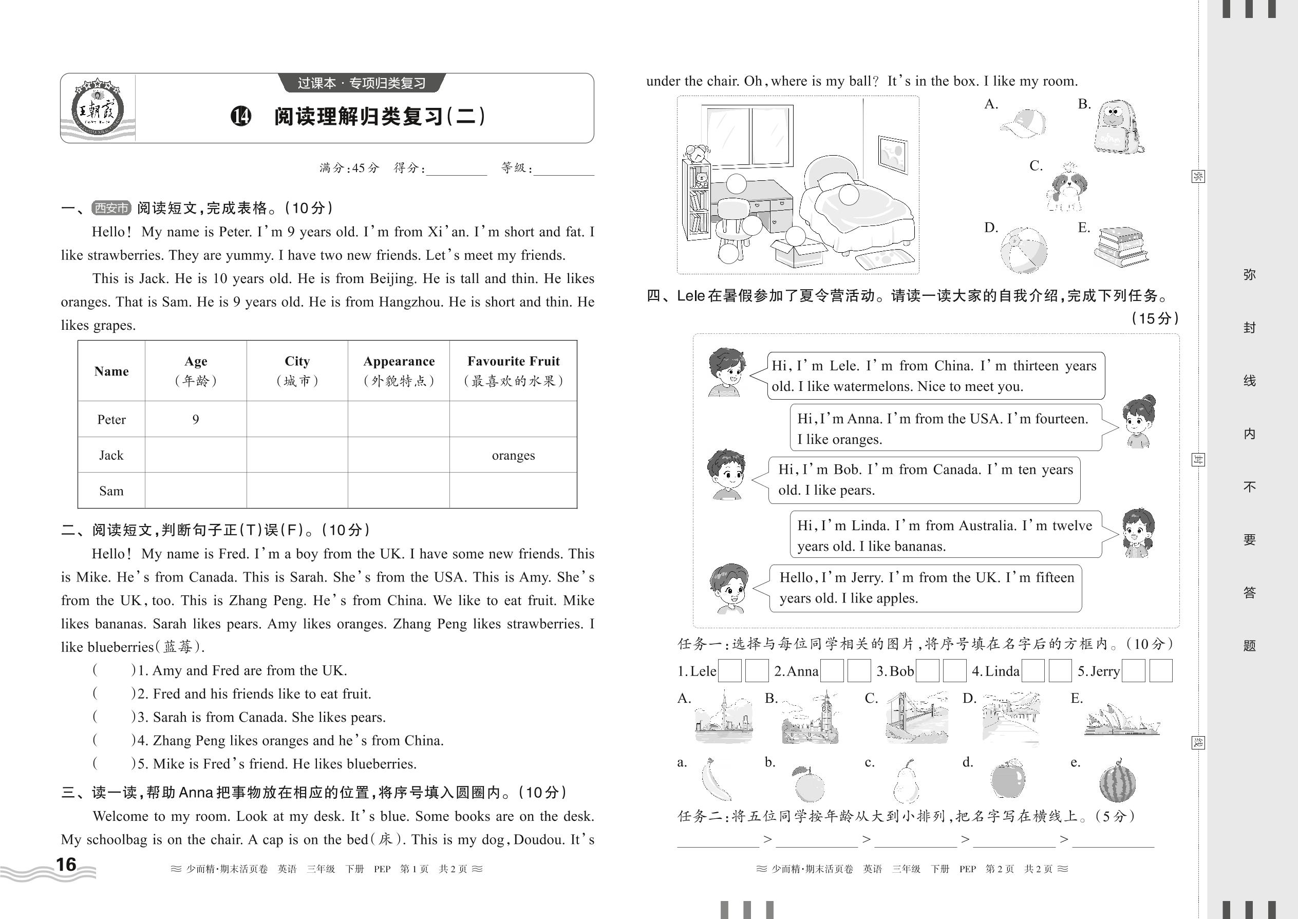2024下册三年级英语人教PEP版 期末过课本HY版·阅读理解归类复习(二)