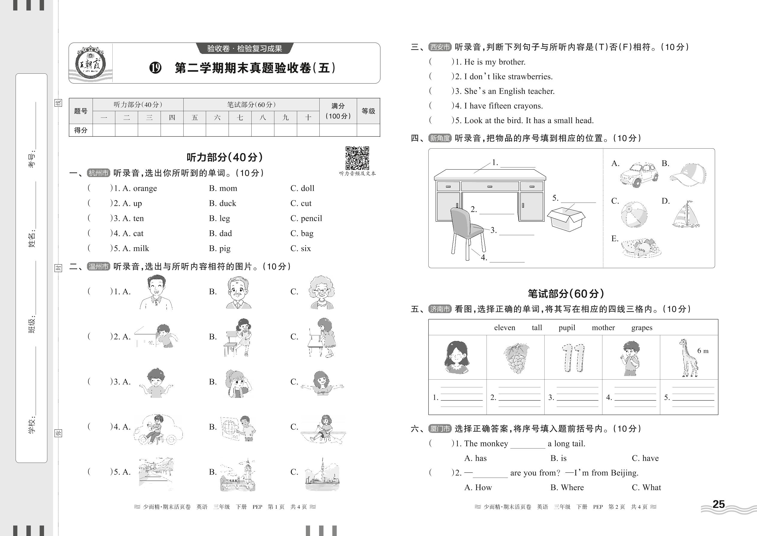 2024下册三年级英语人教PEP版 第二学期期末真题验收卷(五)