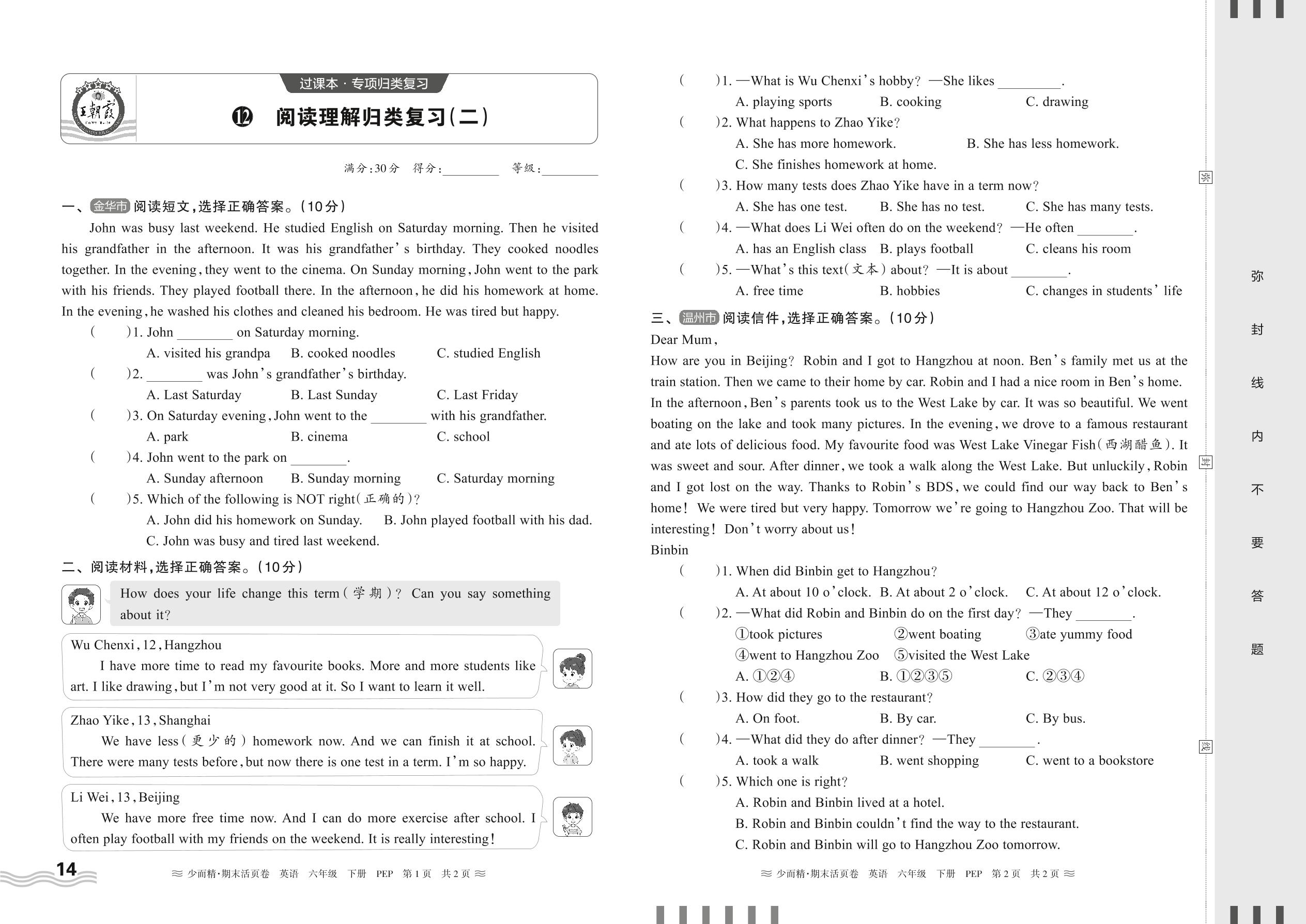 2024下册六年级英语人教PEP版 期末过课本HY版·阅读理解归类复习(二)