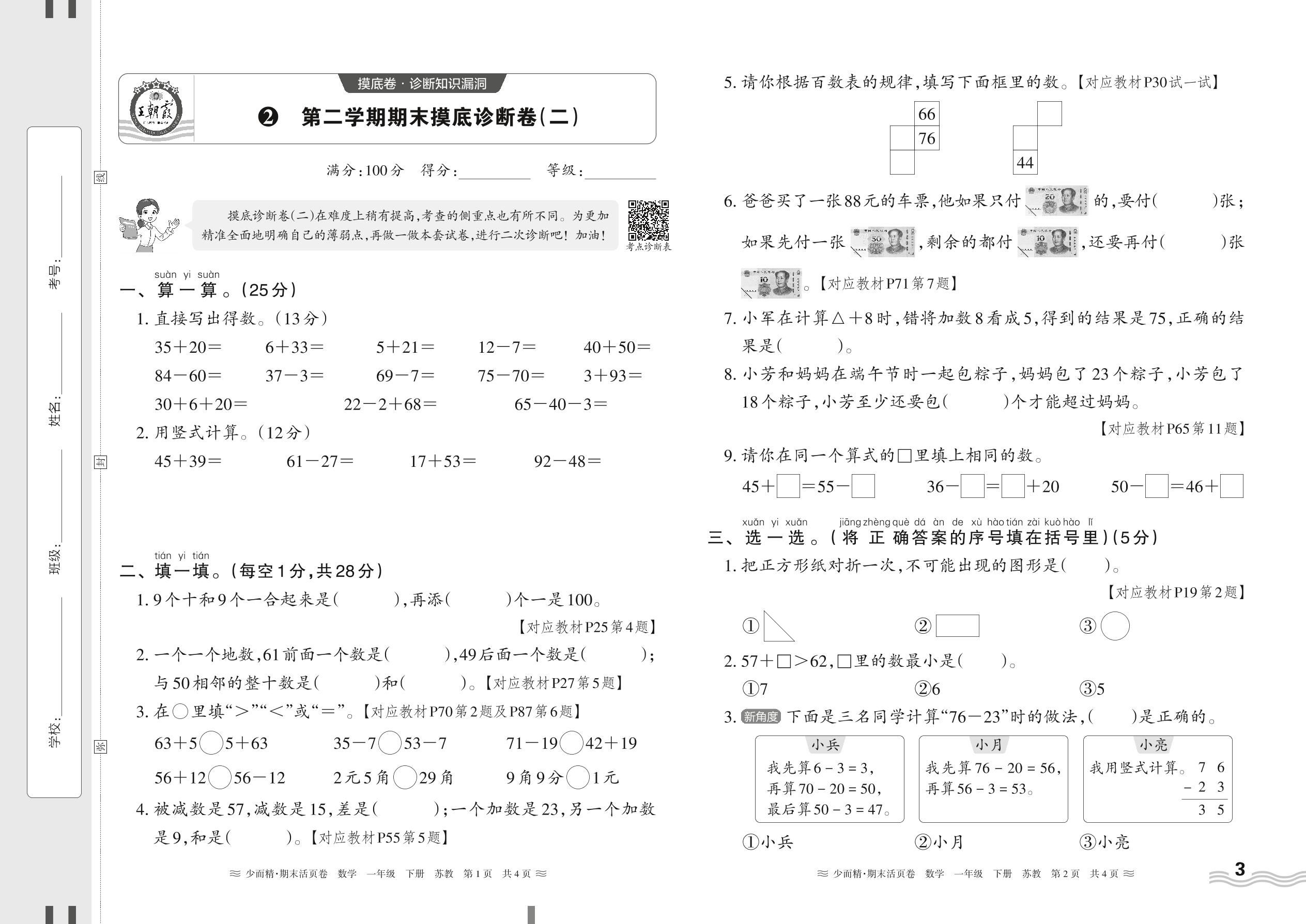 2024下册一年级数学苏教版 第二学期期末摸底诊断卷(二)