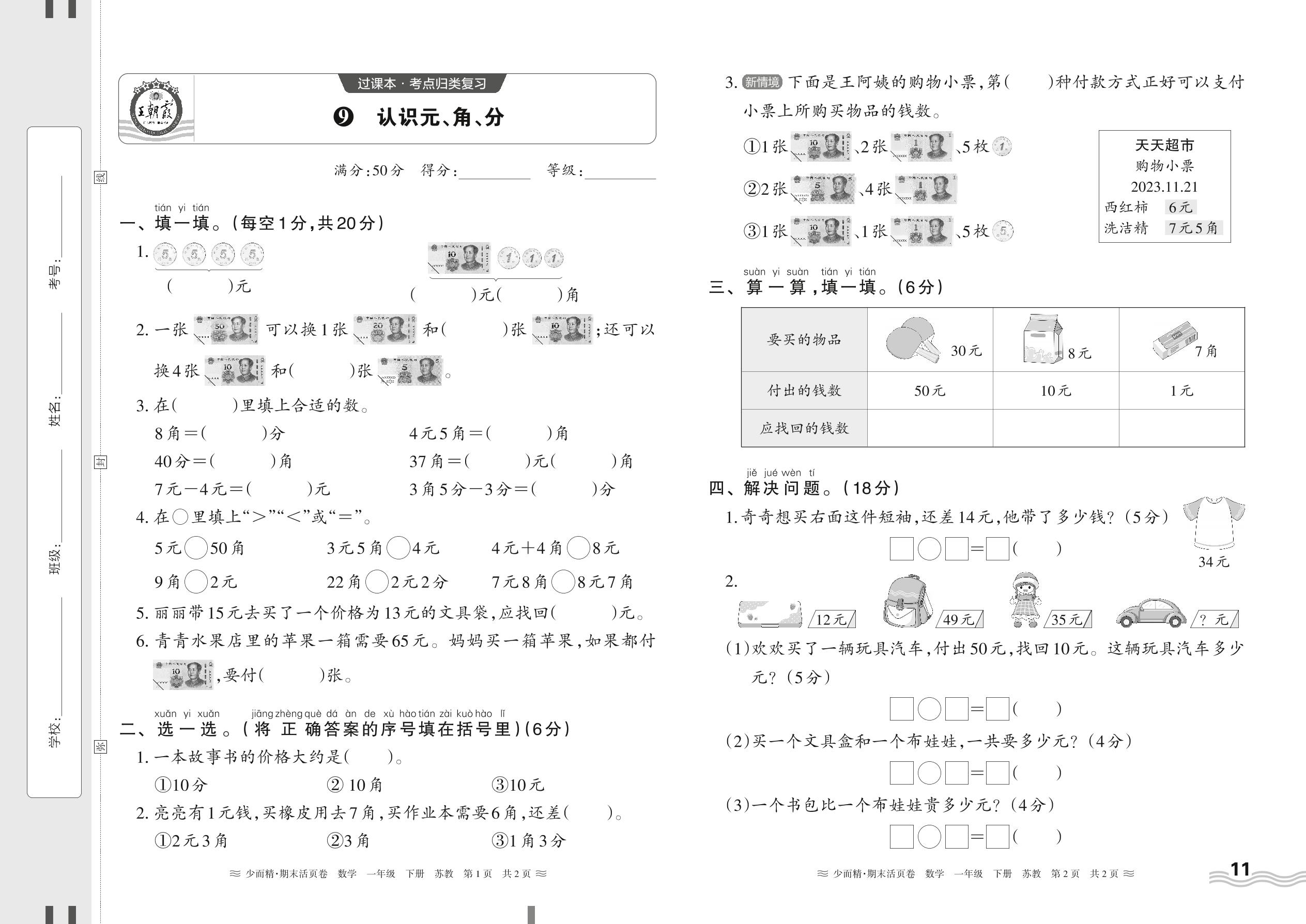 2024下册一年级数学苏教版 期末过课本HY版·认识元、角、分正文【9】