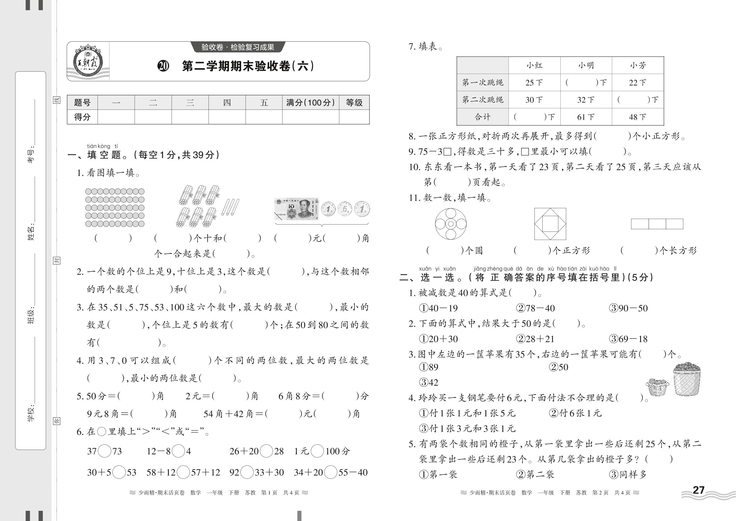 一年级数学苏教版下册期末卷