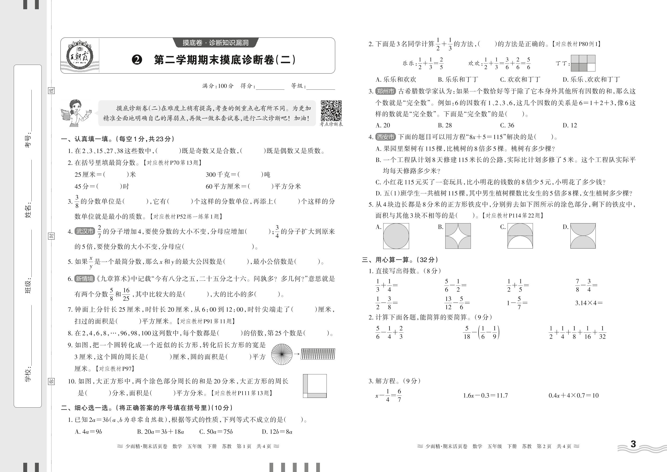 2024下册五年级数学苏教版 第二学期期末摸底诊断卷(二)