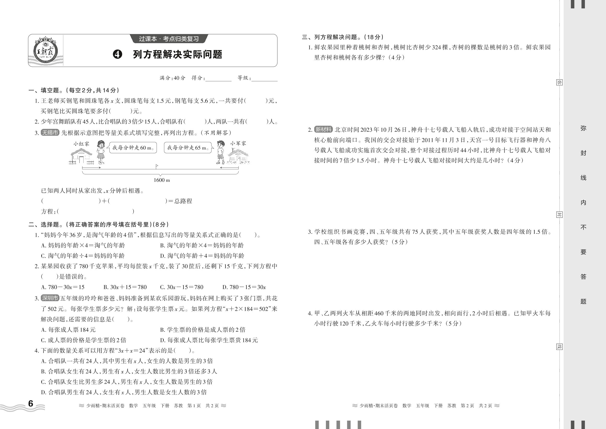 2024下册五年级数学苏教版 期末过课本HY版·列方程解决实际问题正文【4】