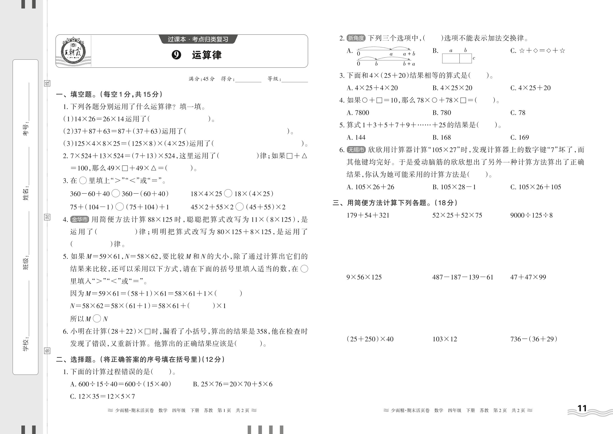 2024下册四年级数学苏教版 期末过课本HY版·运算律正文【9】